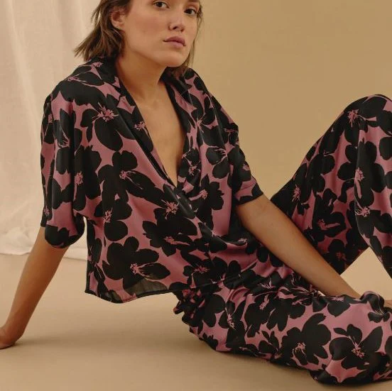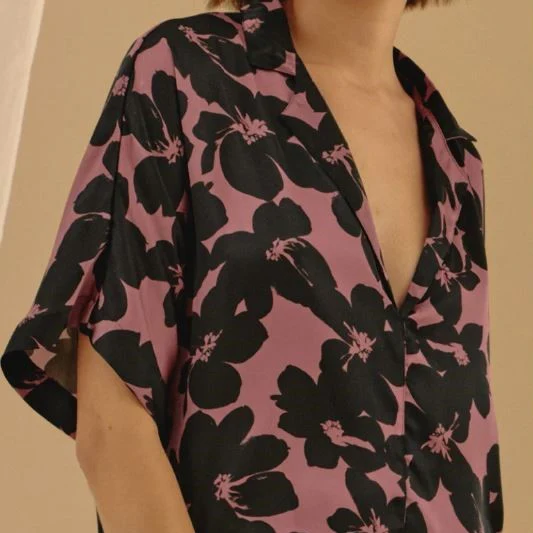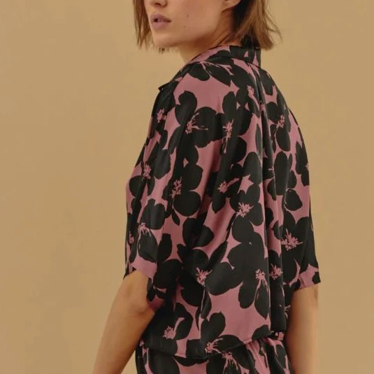 Chemise coupe loose et courte, parfaite pour la maison. Ses motifs fleurs noires sur fond blush et sa matière fluide satinée donnent un effet soft.