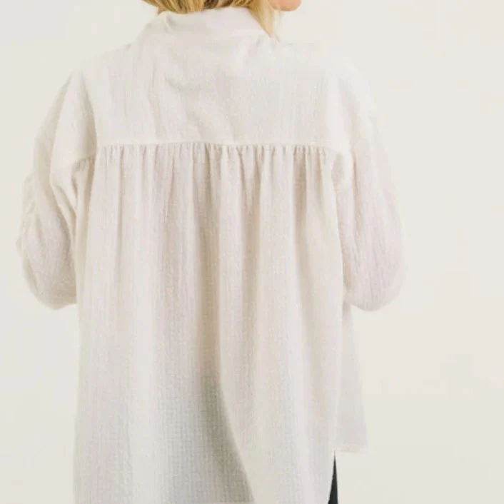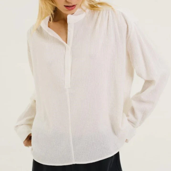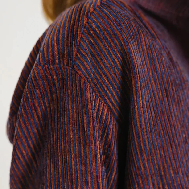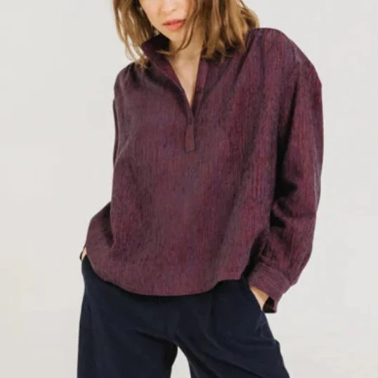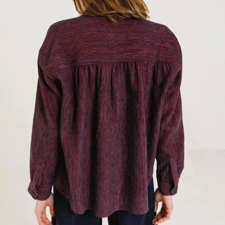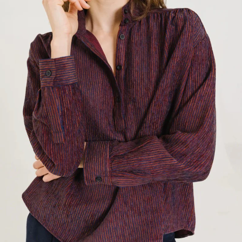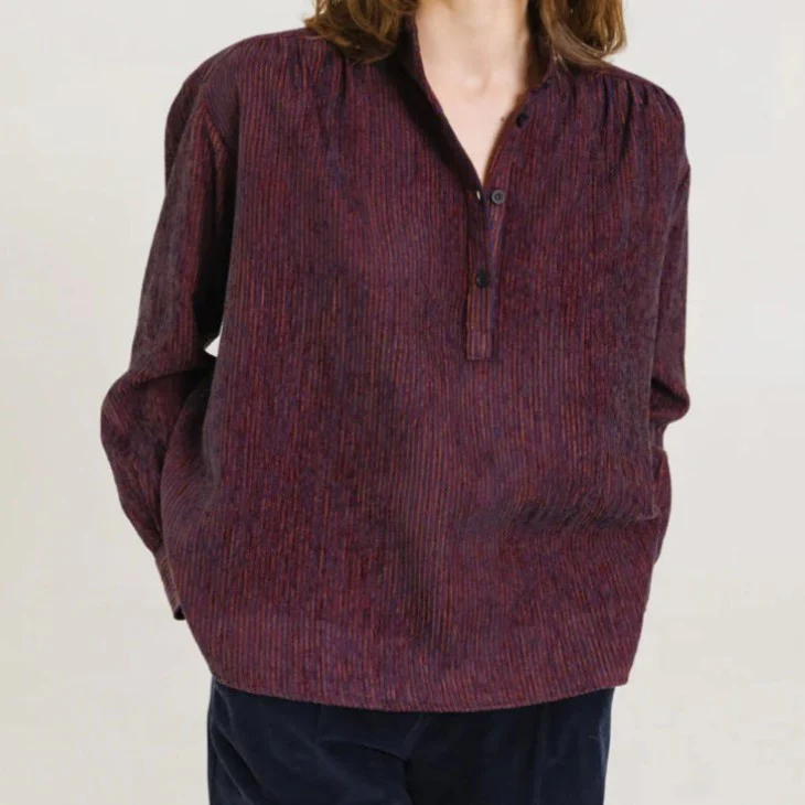 Blouse à col montant en velours rayé aux nuances de rouge et de bleu, également disponible en écru. Sa coupe ample et ses emmanchures basses offrent une silhouette fluide et décontractée, tandis que les fronces à l’avant et au dos ajoutent du mouvement et du caractère. Une patte polo délicate et des bas de manches fermés par un bouton apportent une finition subtilement féminine et raffinée.