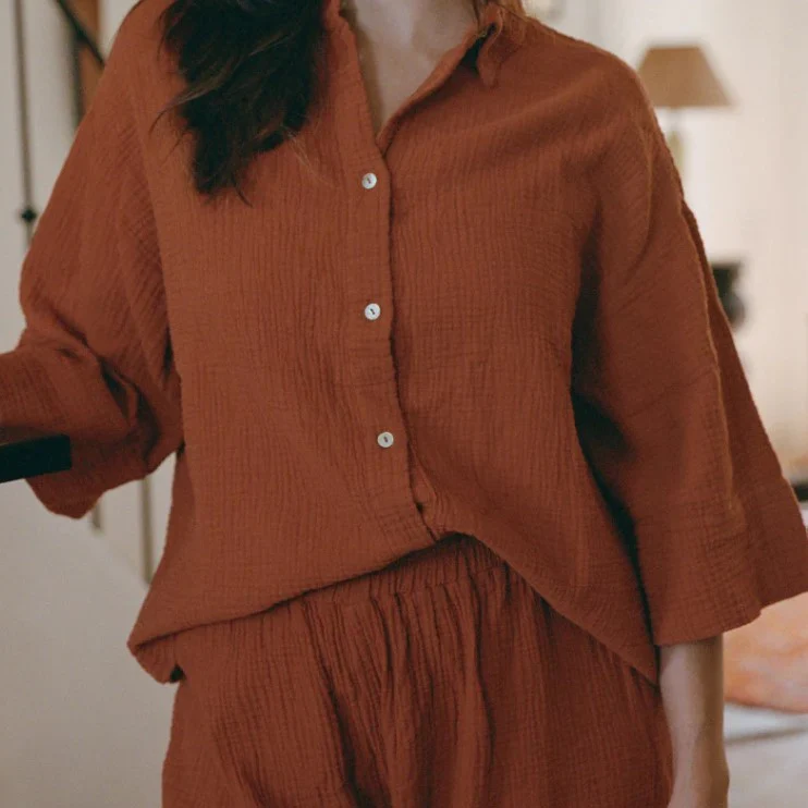 La chemise Mimosa est une chemise ample en double gaze de coton biologique. Chemise iconique chez Nénés, elle se décline cette fois-ci dans un nouveau coloris Terracotta.