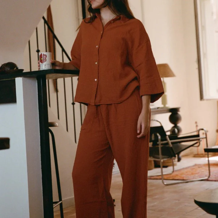 On adore cette nouvelle couleur aux inspirations méditerranéennes, parfaite pour la mi-saison ! Pour aller avec la chemise, nous avons créé un pantalon ultra confortable et versatile que vous pourrez porter aussi bien sur votre canapé que pour aller vous balader.