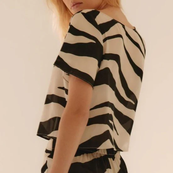 Top manches courtes et coupe droite, avec décolleté V noué à l’avant. On adore sa matière satinée beige et noir, si légère ! Avec son imprimé zèbre, effet sauvage garanti !