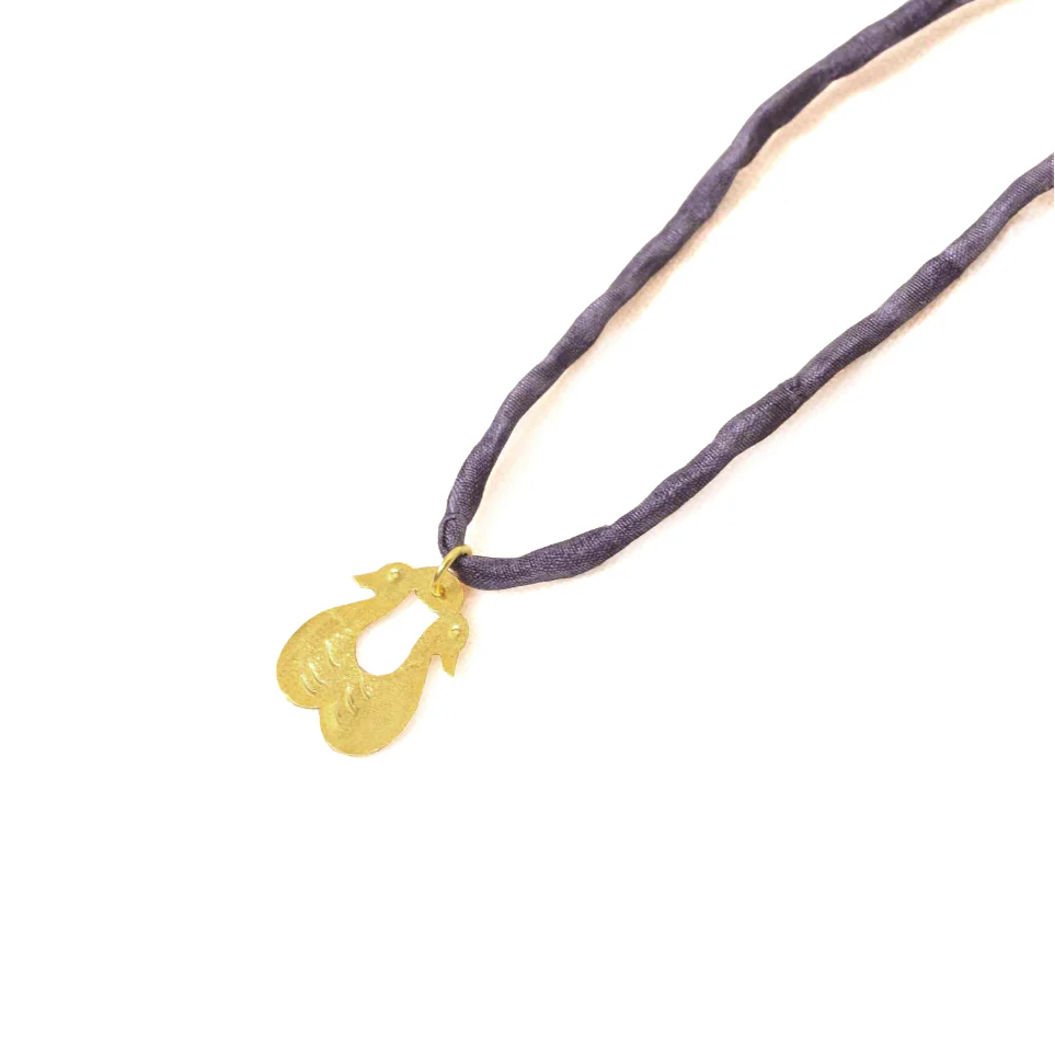 Son pendentif représente deux cygnes dos à dos. Il est monté sur un cordon de soie mauve qui lui apporte une touche d’originalité, un brin bohème.