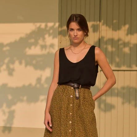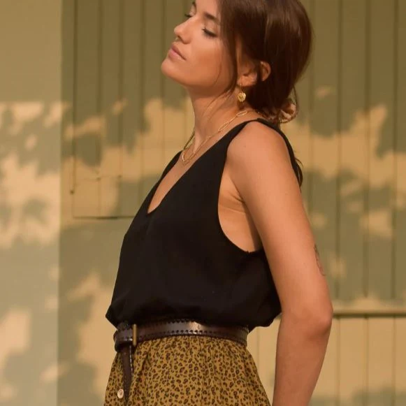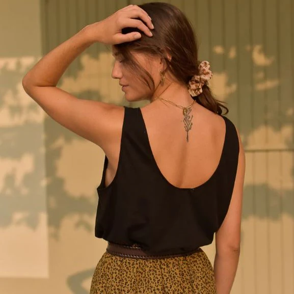 Un top noir d’été, simple mais irrésistible. La pièce parfaite à avoir toujours sous la main ! Son jersey de coton bio en fait un essentiel confortable à porter du matin au soir. Avec son col arrondi délicat et son dos légèrement échancré, ce top allie simplicité et féminité avec finesse. Son noir intemporel en fait un incontournable qui s’associe avec tout.