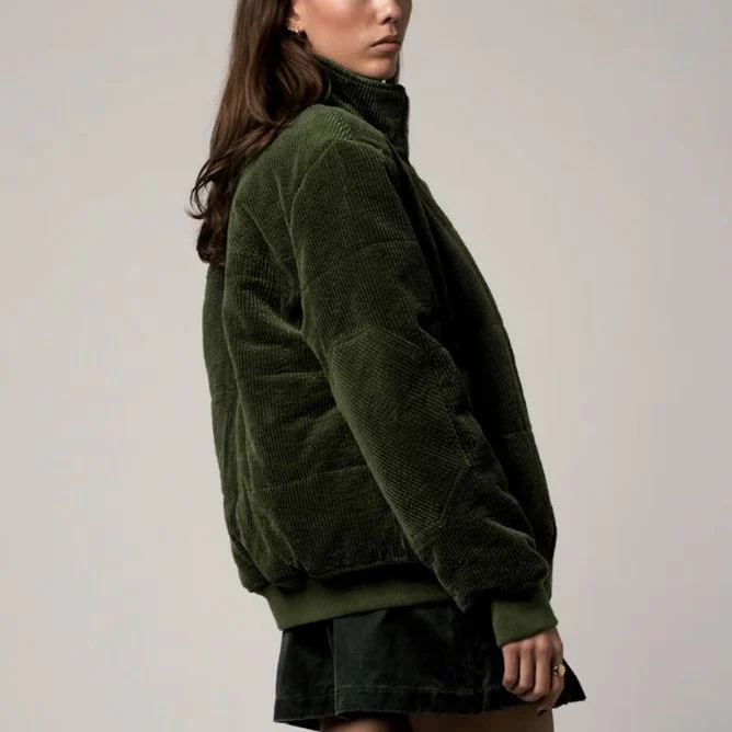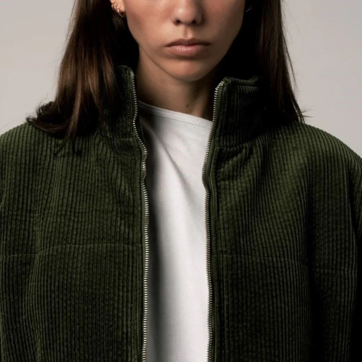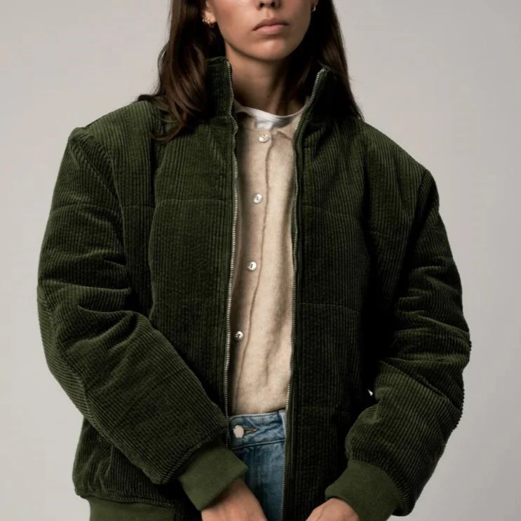Doudoune unisexe en velours côtelé. Ronde et bien rembourrée, serrée à la taille et aux poignets avec un col camionneur qui remonte jusqu’en haut du cou. 2 poches extérieures, 1 poche intérieure Composition : coton 100% biologique / velours grosses côtes 100% biologique tissé en France / Doublure en ouatine Confection en Tunisie