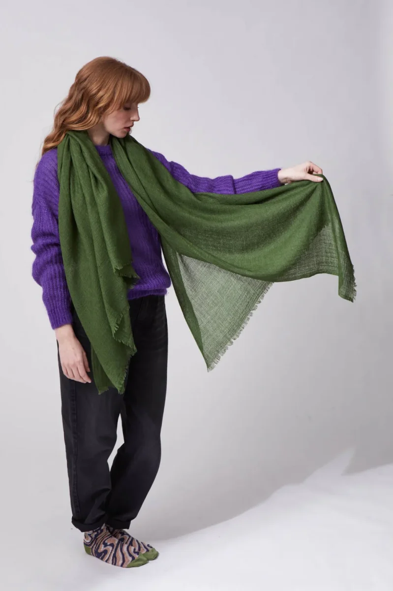 Foulard en laine de couleur unie Kaki à tissage quadrillé qui apporte la texture et l’originalité au modèle. Sa couleur s’accordera parfaitement avec les tons hivernaux. Finitions à bords francs.