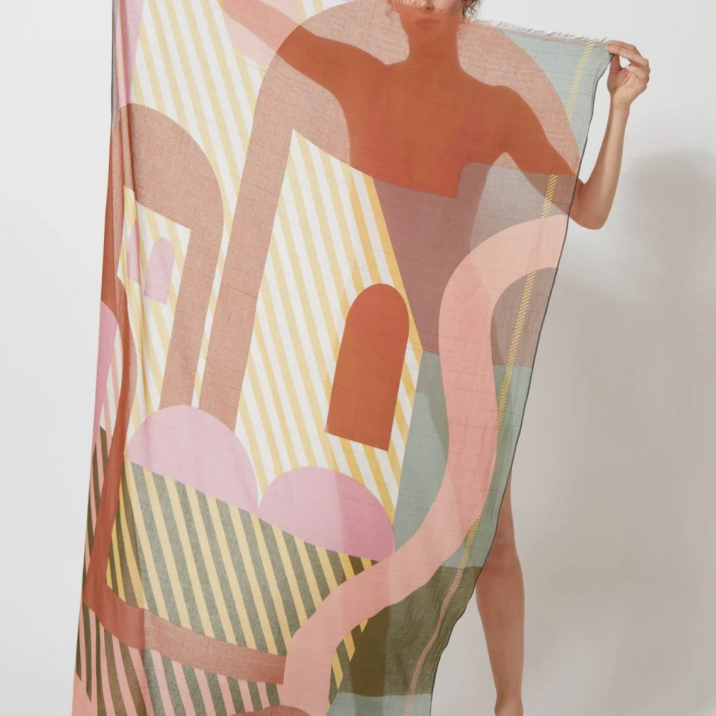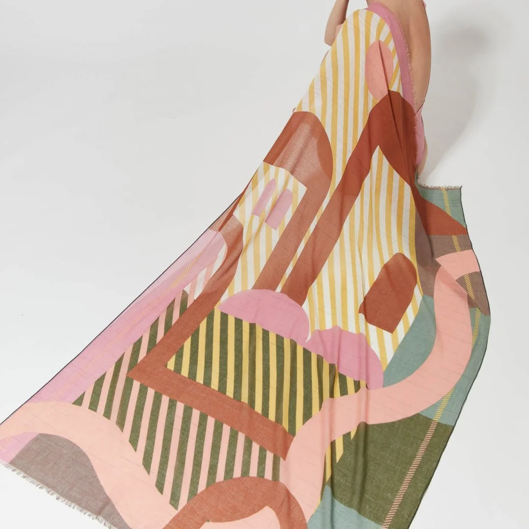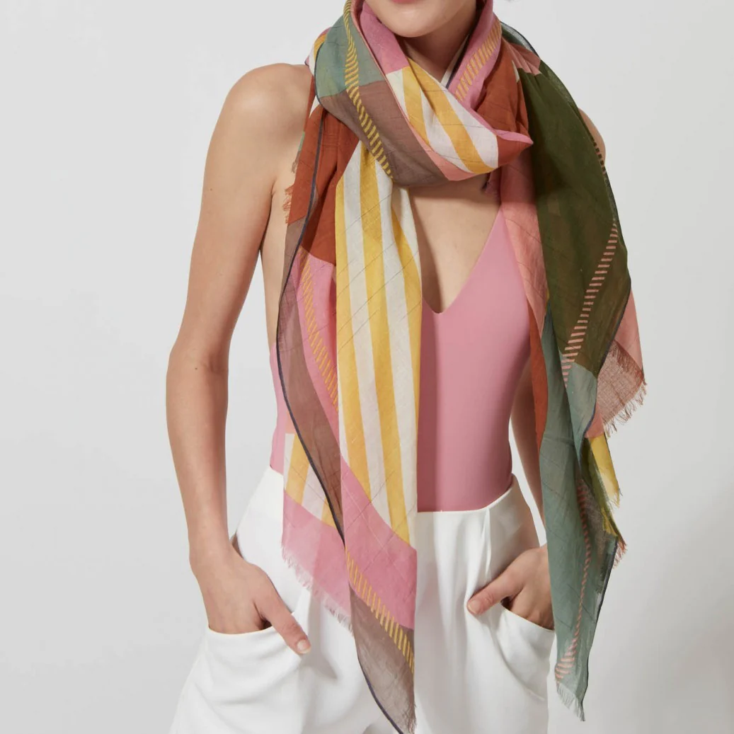 Foulard estival graphique et multicolore à dominante rose. On adore toujours le détail apporté aux motifs et à la qualité des foulards Ma Poésie. 100% Coton organique tissé main et imprimé 100x190cm