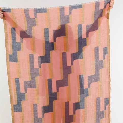 Foulard en laine douce et enveloppante, au motif graphique mêlant lignes tendues et courbes souples. Confortable et élégant, il complète vos silhouettes avec douceur. Dimensions : 100 × 190 cm, 100% laine.