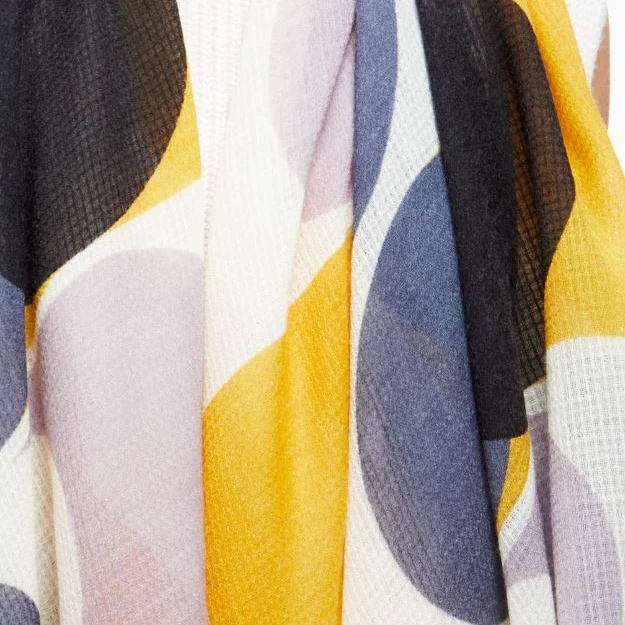 Grand foulard aux graphismes de tons moutarde et pastels, imprimé avec la technique ancestrale au cadre, un procédé d’impression sérigraphique qui consiste à passer des cadres plats sur le tissu préalablement entoilé sur de longues tables d’impression de plusieurs mètres. 100% Laine 100 x 190 cm