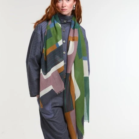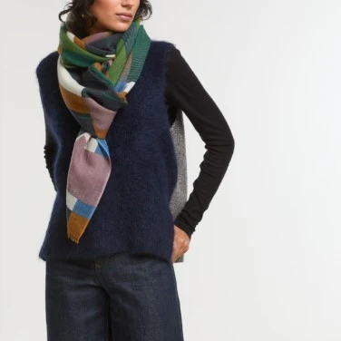 Foulard en laine fine imprimé au cadre, au motif structuré et élégant où les formes s’emboîtent avec précision. Sa palette de couleurs subtile et raffinée en fait un accessoire incontournable pour compléter votre silhouette avec finesse. Dimensions : 70 × 190 cm, 100% laine.