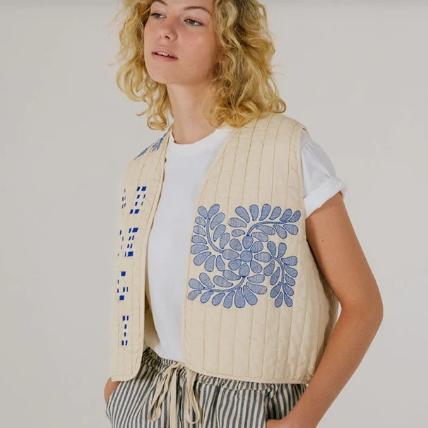 CORTO est un gilet matelassé et brodé, parfait sur un t-shirt, une chemise, une robe.