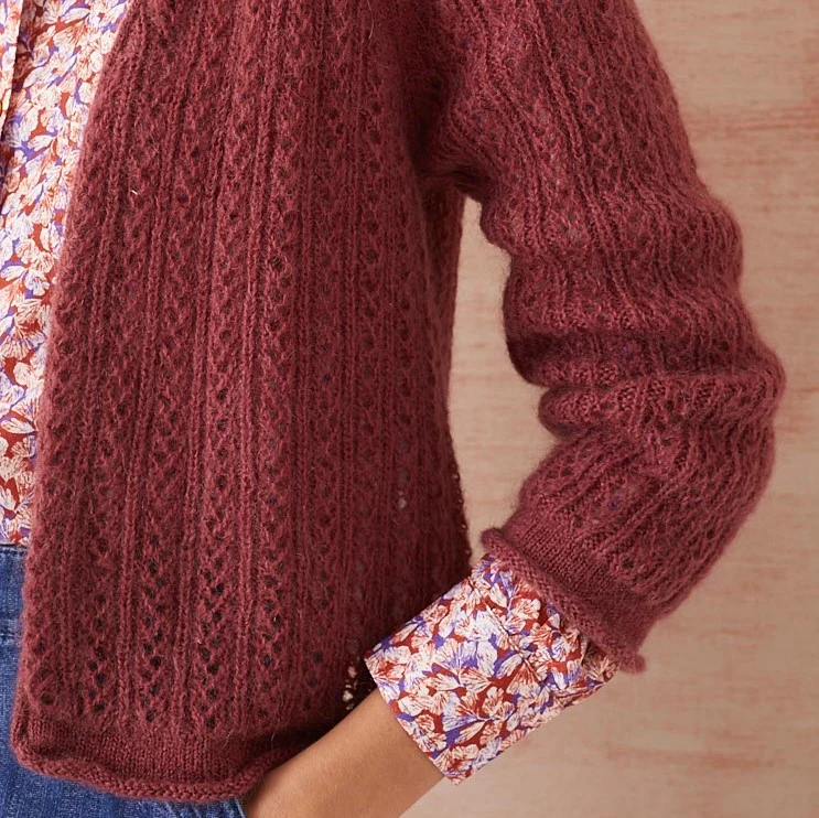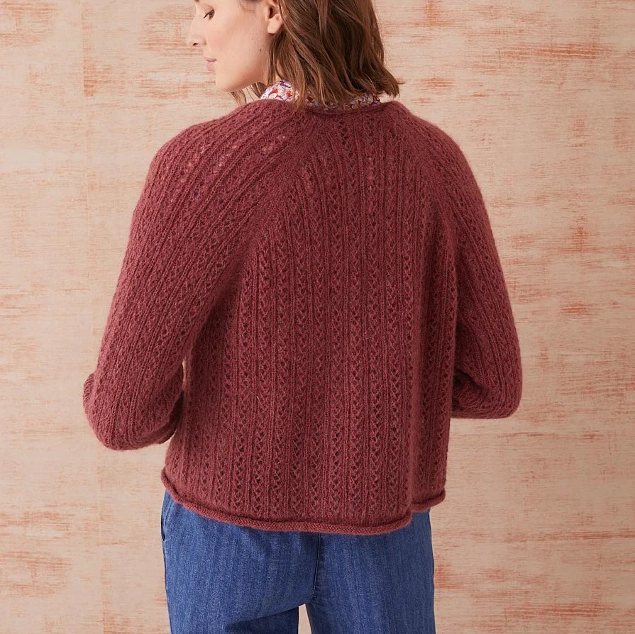 Gilet sans boutons couleur terracotta, tricoté, manches 3/4. Le mohair et coton laine lui apporte une grande douceur. 38% de MOHAIR, 37% de COTON et 25% de LAINEDimensions pour une taille S : Hauteur totale : 54 cm Tour de poitrine : 96 cm