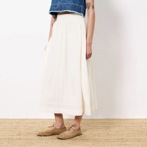 Confectionnée en coton 100% fluide, cette jupe longue séduit par ses détails brodés raffinés et sa taille élastiquée qui assure confort et maintien. Une pièce facile à porter, pleine de charme et de légèreté.