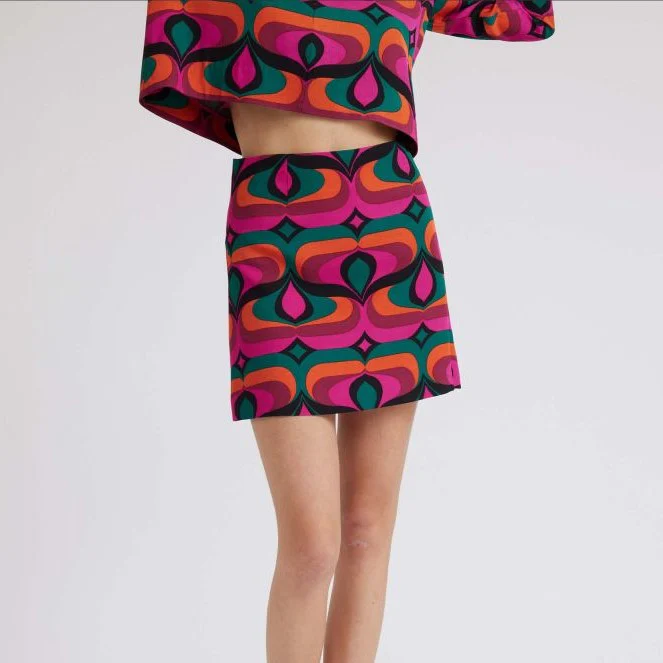 Jupe courte trapèze à l’imprimé 60’s, qui dévoile les jambes et égaye la saison froide. Irrésistible !