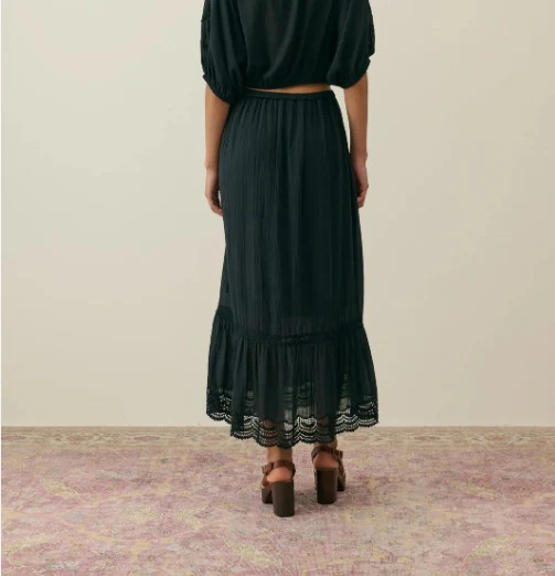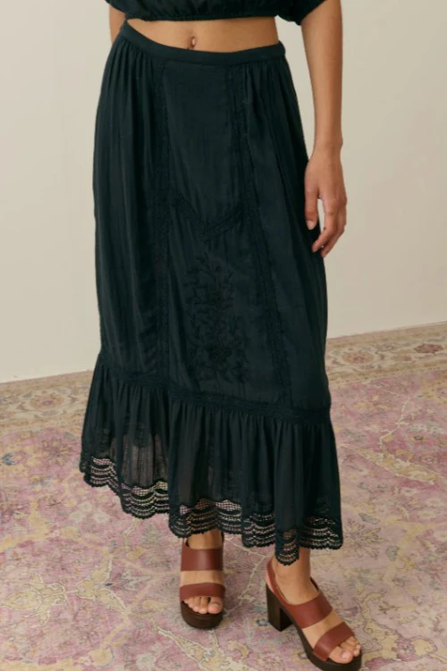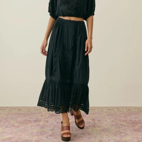Cette jupe à la coupe droite allie simplicité et raffinement. Confectionnée en 100% coton organique, elle se distingue par ses broderies florales et ses finitions festonnées en broderie anglaise. Sa fermeture zippée et sa taille normale assurent un porté structuré tout en douceur.