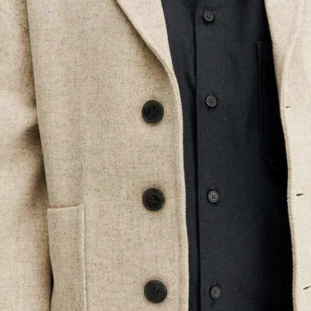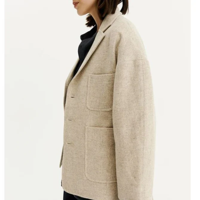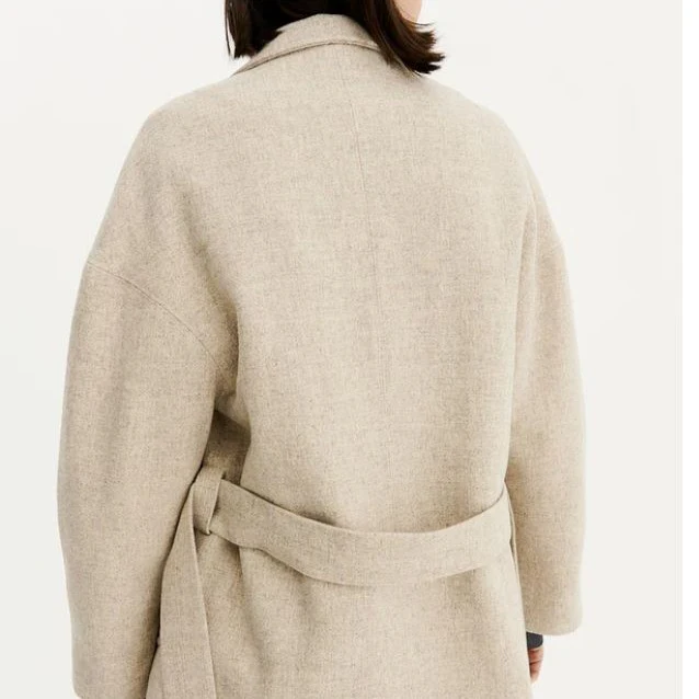 Manteau court unisexe en 100% laine. Coupe ample droite et ceinture amovible pour une silhouette plus définie. Poche poitrine plaquée et poches avant.