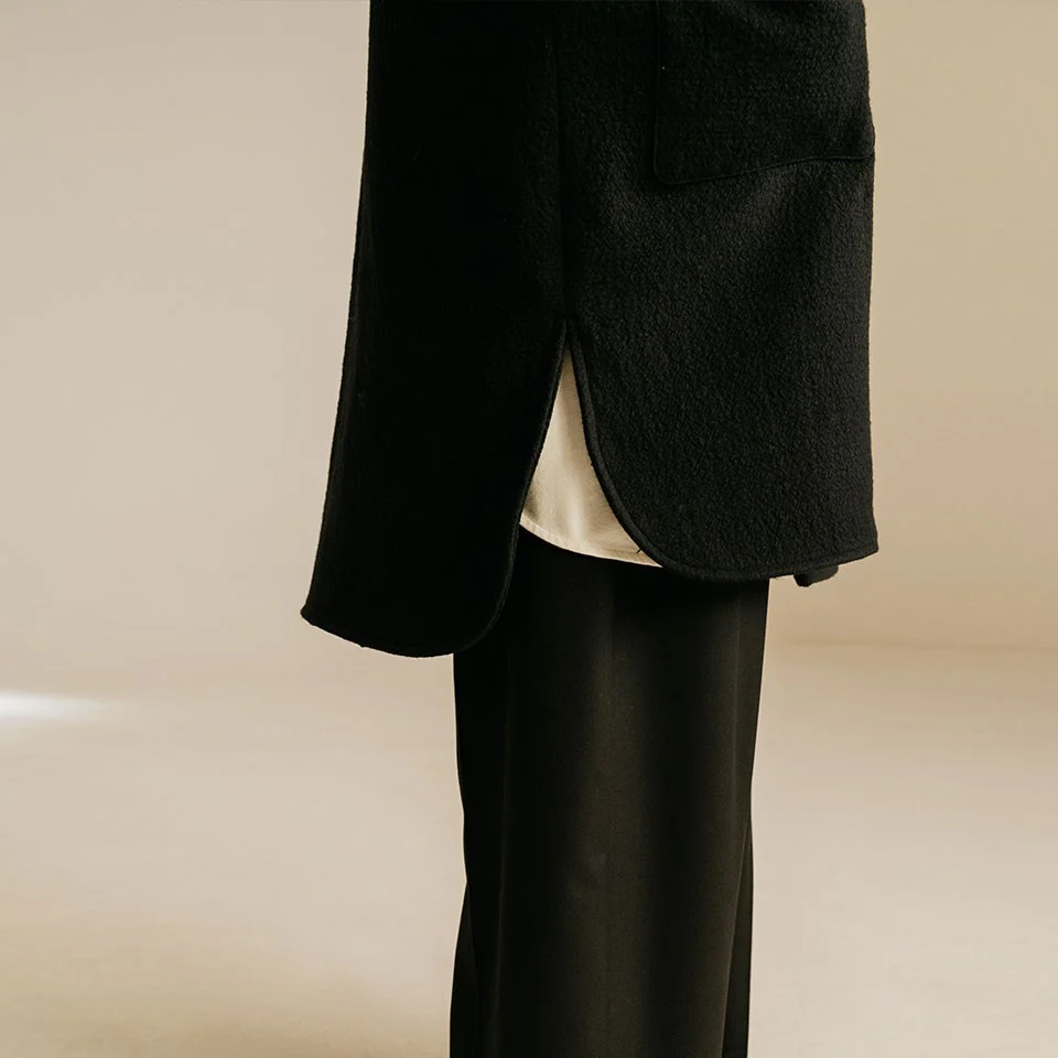 Manteau à col droite esprit “teddy” coupe loose et droite, longueur genoux. Deux poches fendues aux côtés et deux poches plaquées aux devants. Fentes aux cotés et bords arrondis.