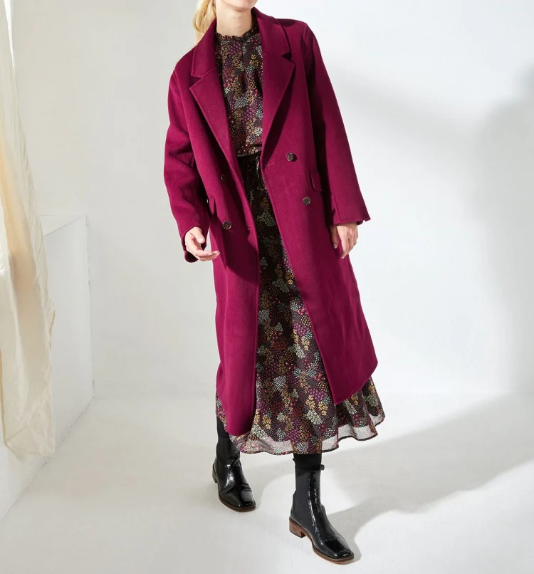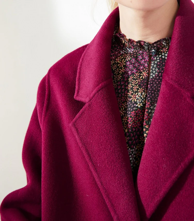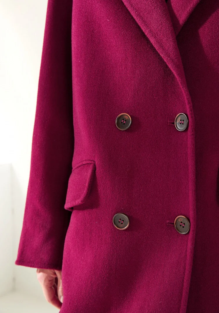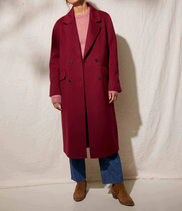 La manteau Charlio couleur Framboise a une coupe droite et est composé à 100% de laine (intérieur et extérieur) et certifié RWS, norme qui garantit le bien-être animal, le respect de la biodiversité et des normes sociales.