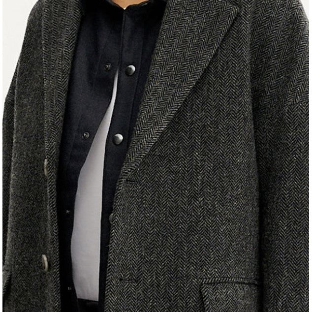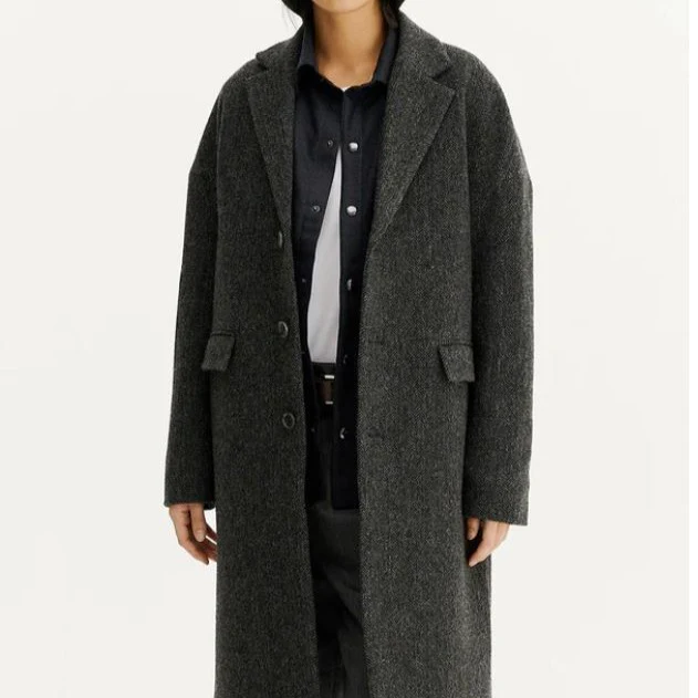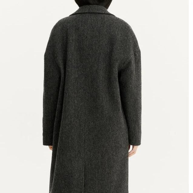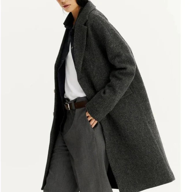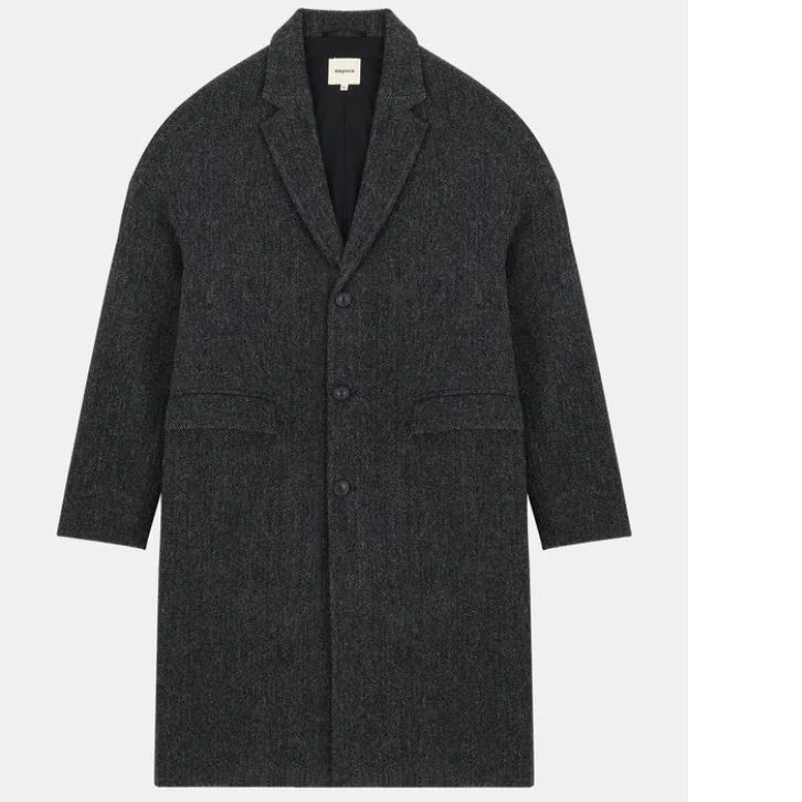 Manteau mi-long unisexe a col tailleur en laine recyclée et biologique certifiée GOTS (Global Organic Textile Standard). Emmanchures basses, poches passepoilées doublées avec rabats, fermeture par boutons en ivoire végétal (corozo).