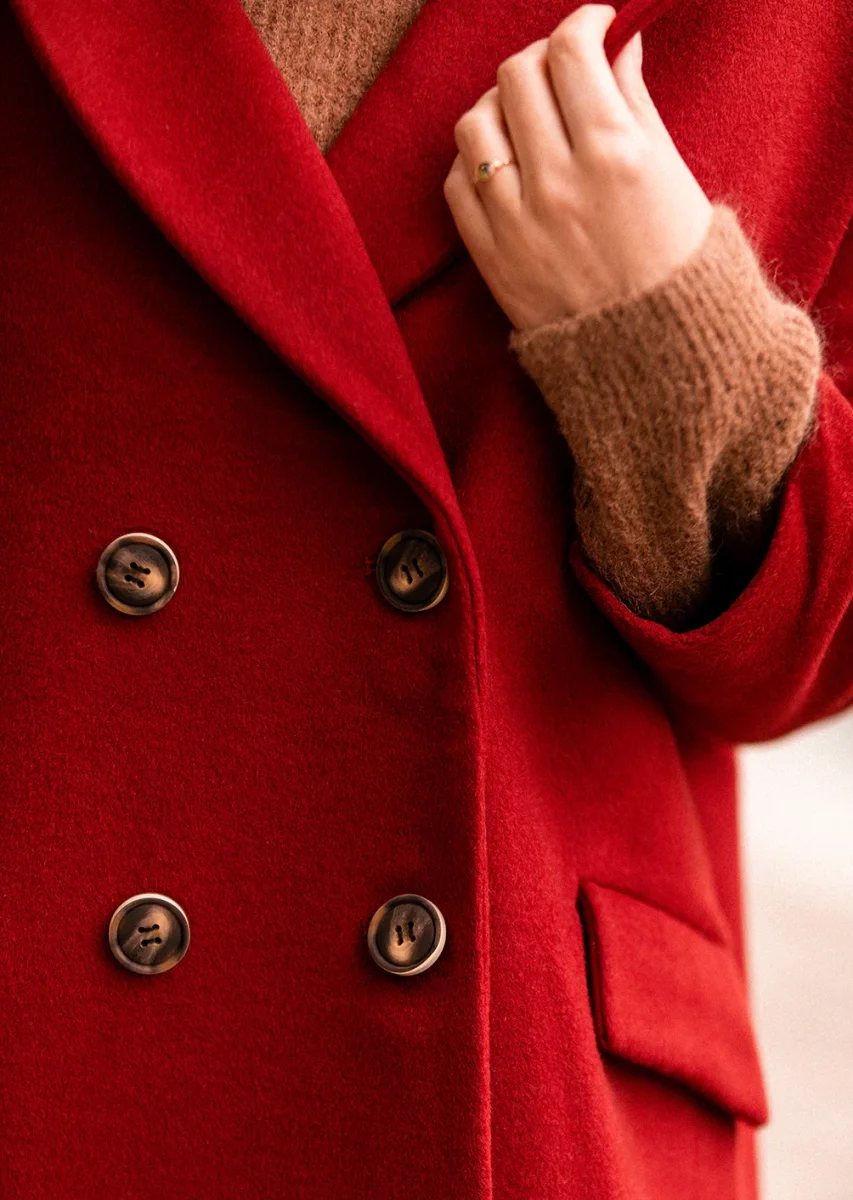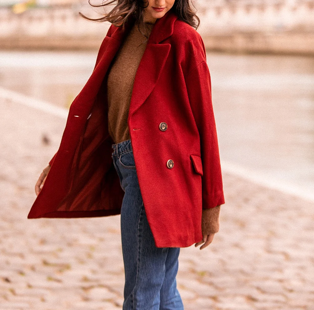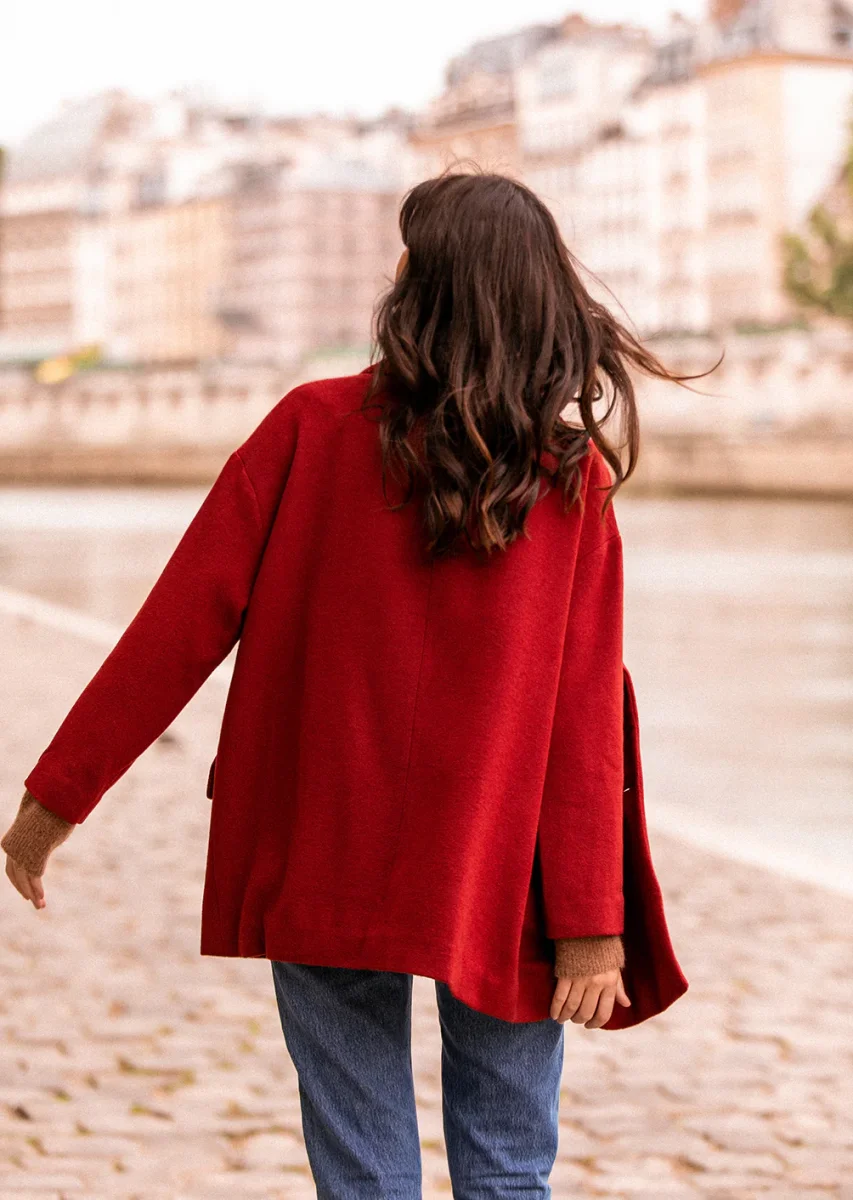 Manteau oversize couleur rouille / rouge brique, court à double.