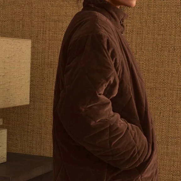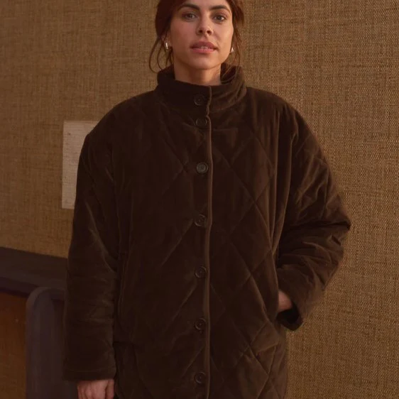 Manteau Louisa en velours matelassé chocolat, 100 % coton. Coupe ample et col montant pour un effet cocon. Doublure moumoute et ouate intérieure pour une chaleur optimale. Boutons effet corne, poches discrètes. Fabriqué au Portugal, certifié Oeko-Tex.