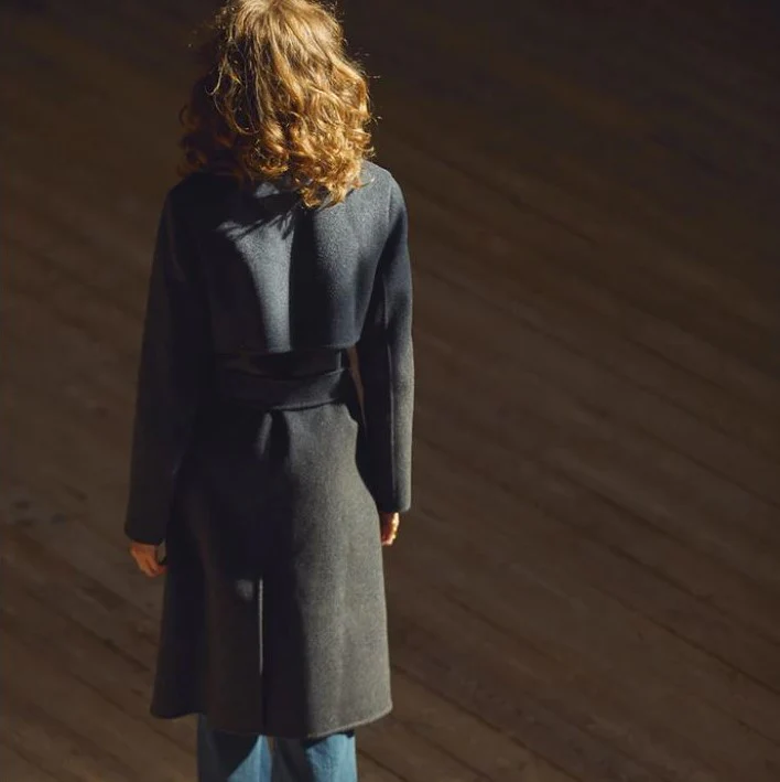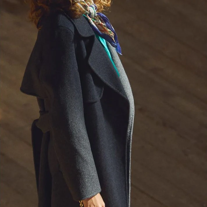 Manteau long en laine avec col tailleur à revers, entièrement cousu à la main.