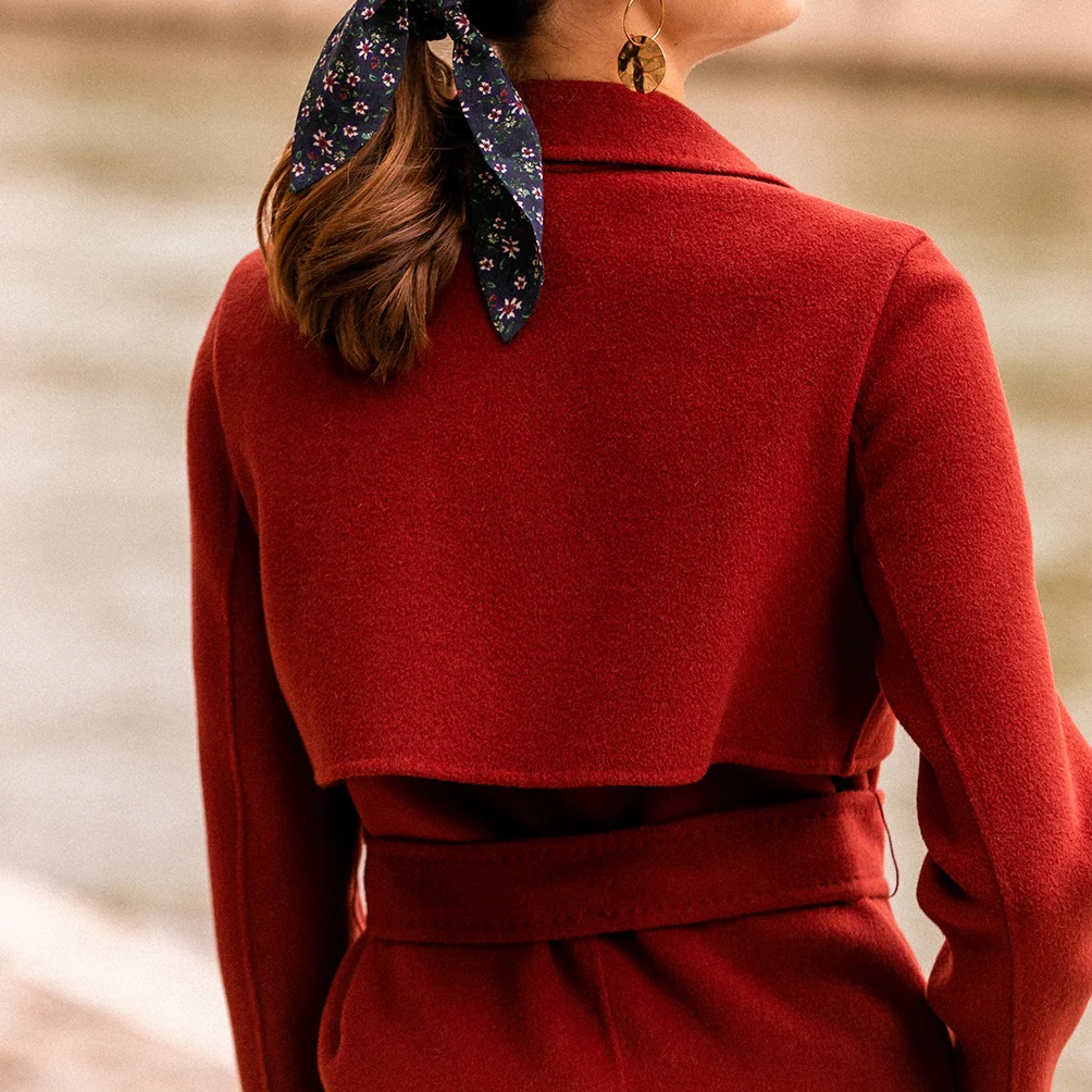 Manteau long façon Trench couleur rouille / rouge brique, 100% laine, cousu à la main.