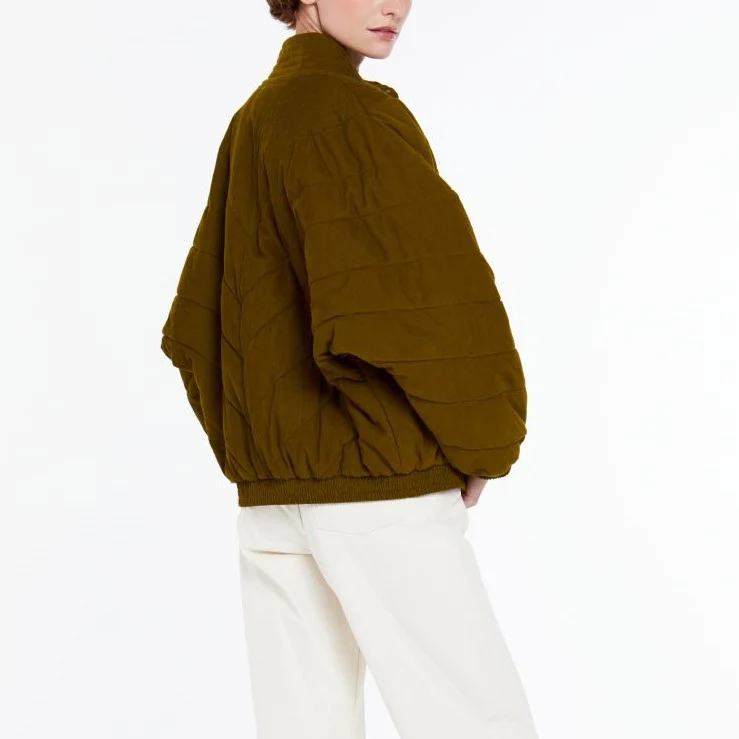 Manteau matelassé en velours de coton uni kaki à col montant. Poignets et bas du corps élastiqués. Poches côtés et boutonnière sur le devant. Surpiqûres ton sur ton