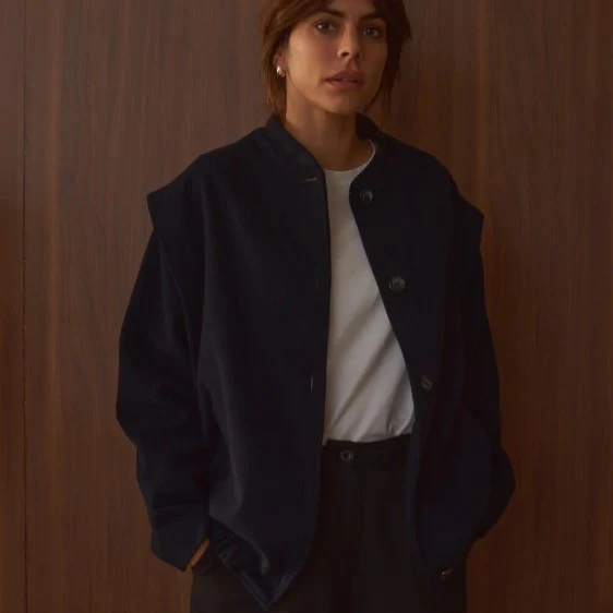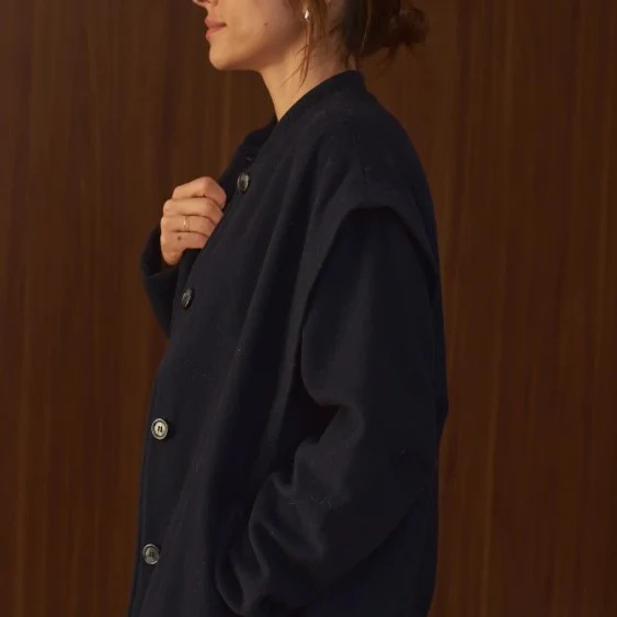 Manteau Philo, mélange de 90 % laine et 10 % cachemire. Coupe courte et structurée, doux, chaud et élégant. Teinte navy intemporelle, finitions minimalistes, col rond, poches passepoilées et boutons effet corne. Fabriqué au Portugal, certifié Oeko-Tex.
