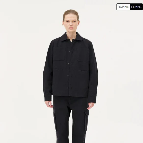 Sa coupe droite, ses poches fonctionnelles et ses boutons-pression en métal en font une pièce pratique et durable, fabriquée avec soin dans nos ateliers partenaires en Roumanie.