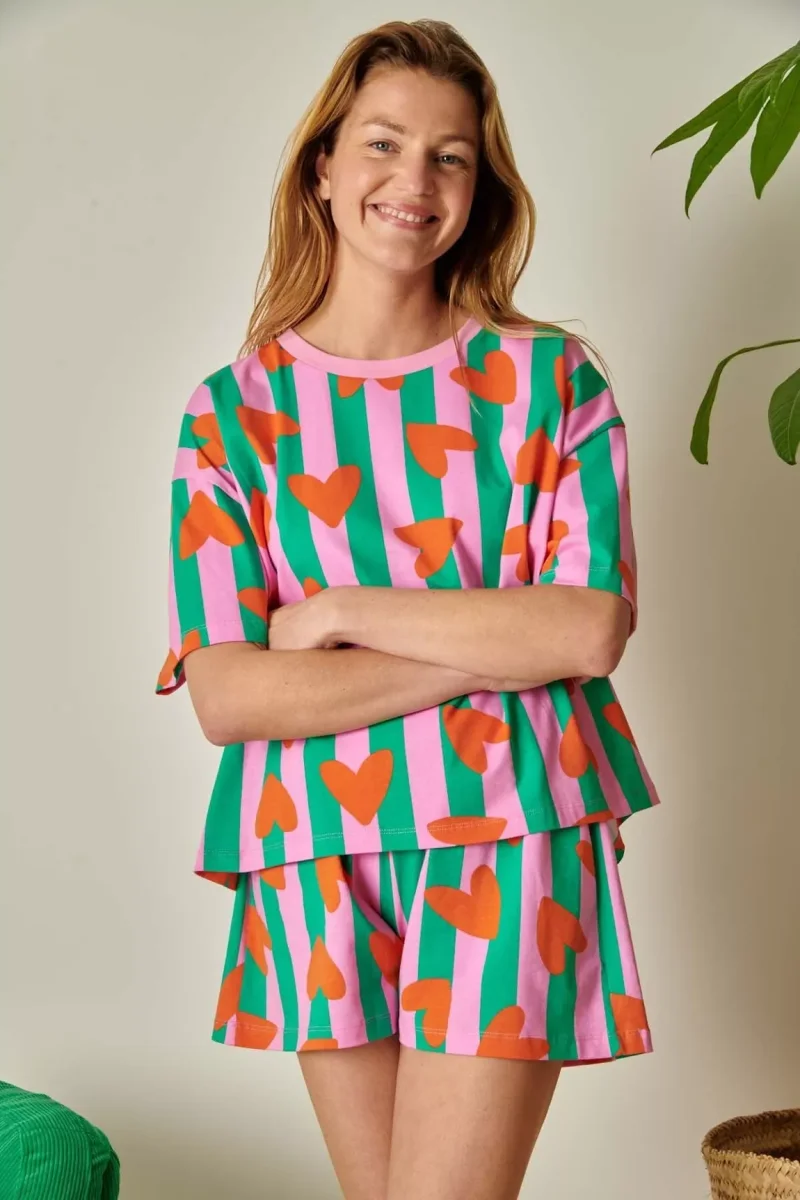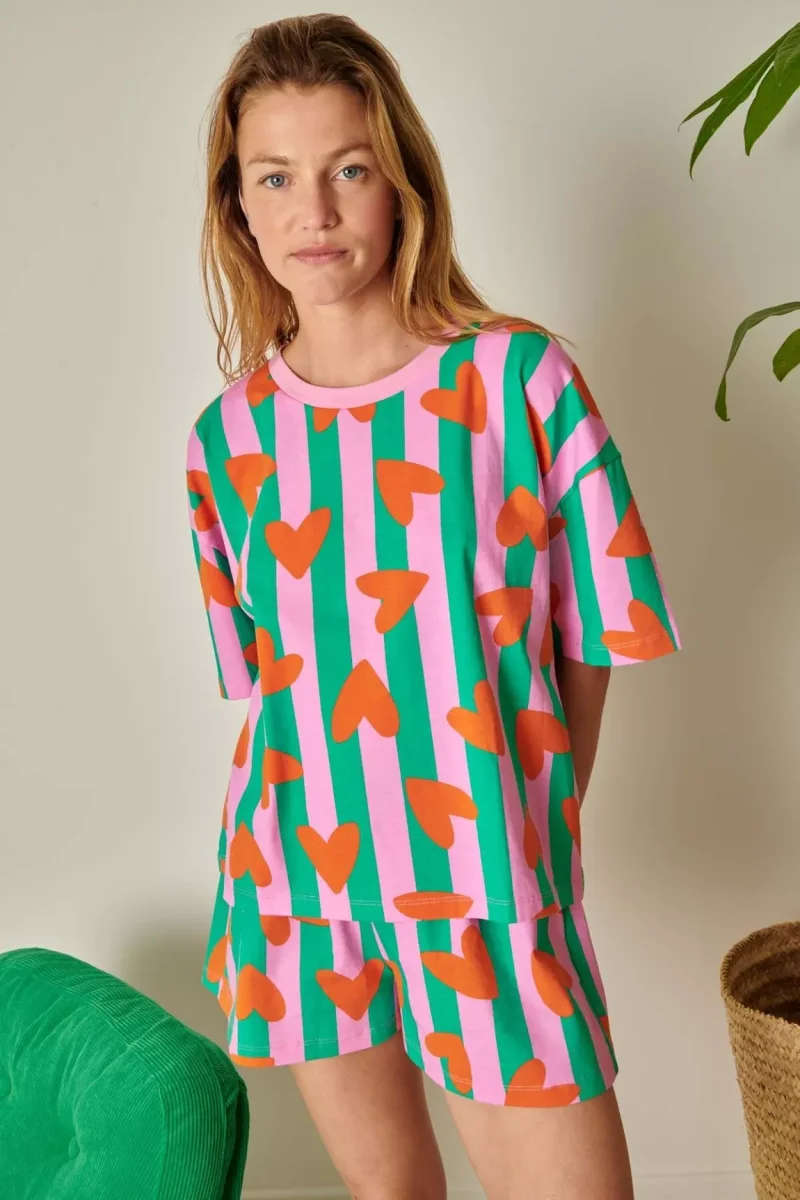 Cet ensemble, c’est un peu le Saint Graal du roupillon : un tee-shirt oversize parfaitement coupé qui tombe nickel, assorti à un short (pas trop court, pas trop long) avec un élastique à la taille. Le tout en coton bio assez épais pour que ça ne soit pas froissé au 1er dodo d’une part, mais surtout pour être vraiment au max du confort possible toute la nuit. 🛌