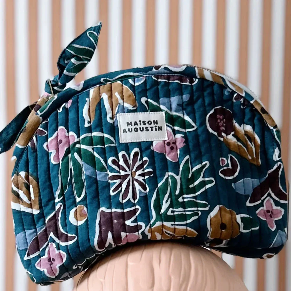 Composition – Entretien * 100% Coton matelassé * Fermeture avec zip caché * Doublure étanche plastifiée * Fabriqué en Inde Cette trousse a été imprimé de manière artisanale selon la technique d’impression blockprint et confectionné à Jaipur en Inde. Cette confection manuelle peut entraîner certaines irrégularités qui en font le charme et le rendent unique ♡