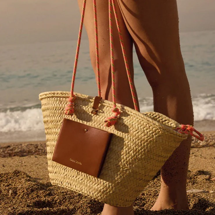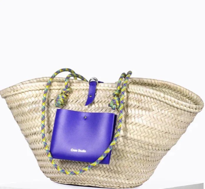 Sac panier en fibres de palmier taille medium, il est pratique, chic et original avec sa cordelette en corde et ses empiècements en cuir.