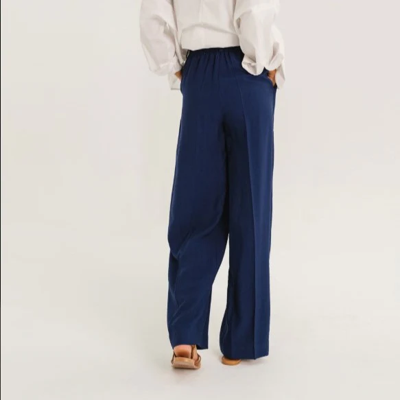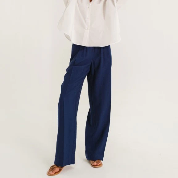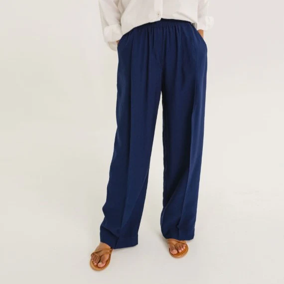 Sa taille élastiquée assure un confort optimal, tandis que ses larges plis sur le devant apportent du mouvement et une silhouette élancée. La jambe loose se resserre délicatement vers le bas pour une ligne moderne et flatteuse. Les poches italiennes à l’avant viennent parfaire son esprit chic et décontracté.