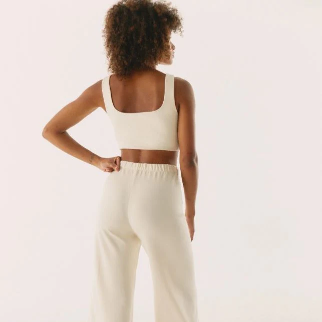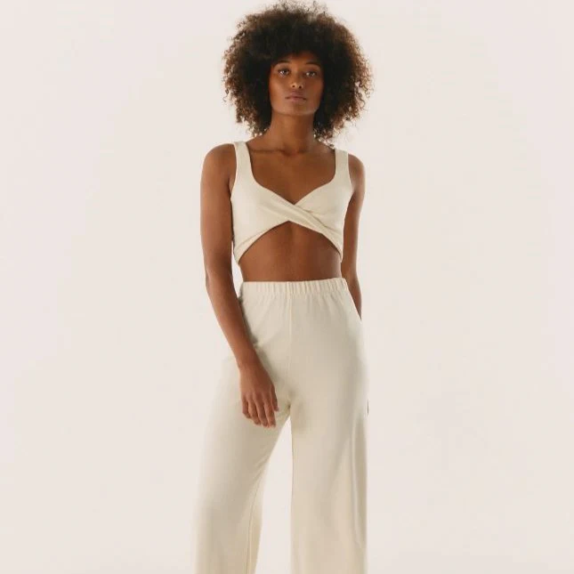 Pantalon en maille écru ultra confort, coupe large et ceinturé à la taille.