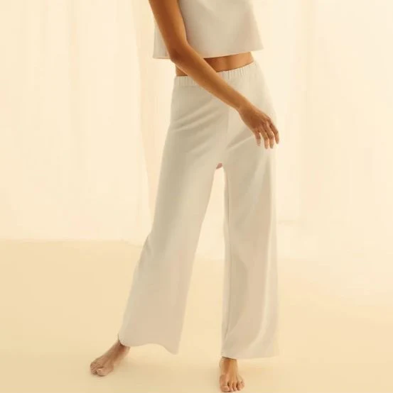Pantalon en maille blanche casual, cool & confort. Le combo parfait pour notre pantalon homewear. Coupe large à porter taille haute pour une silhouette perfect