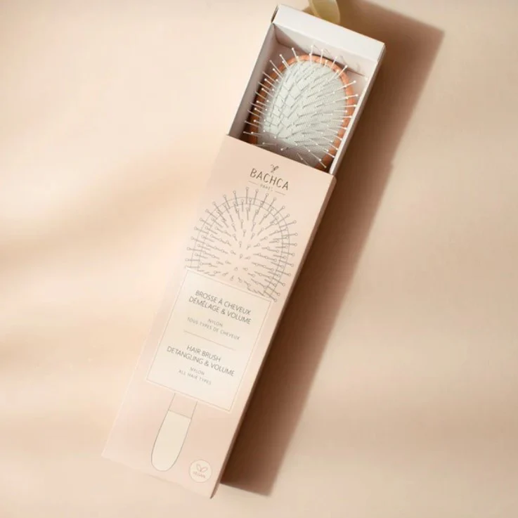Brosse en bois naturel, idéale pour démêler les cheveux en douceur, sans casse ni douleur. 🌿Les picots nylon, végans, ultra flexibles, pénètrent les cheveux en profondeur et démêlent sans tirer ni abîmer les cheveux.