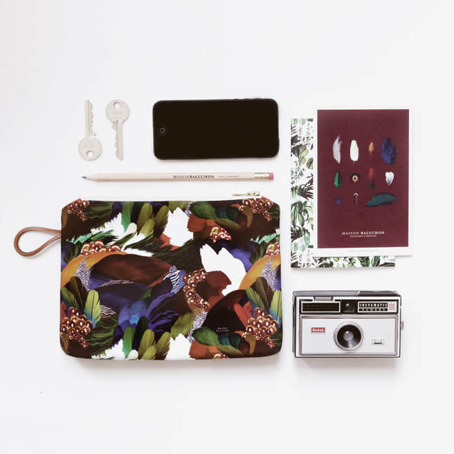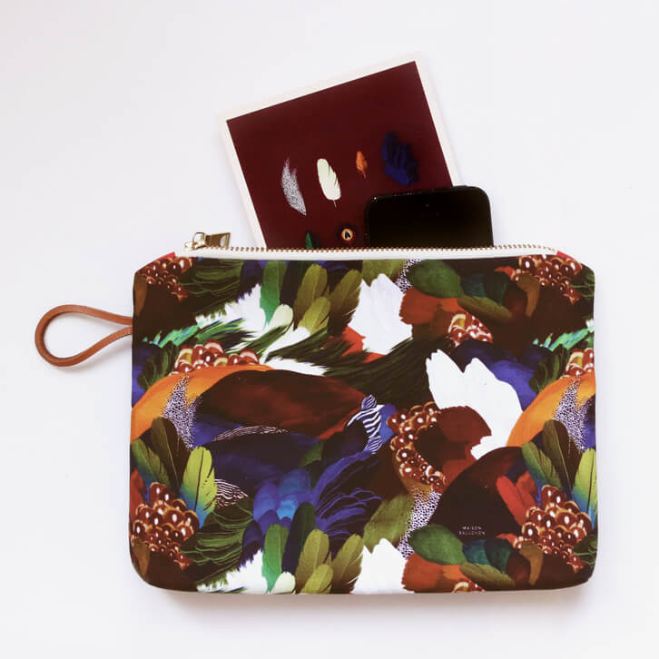 Mini pochette à fermeture éclair. Idéale pour y stocker vos essentiels du quotidien, petits accessoires, stylos et maquillage… Format 21 x 15 cm Fermeture zippée écrue dorée et doublure coton rouge.