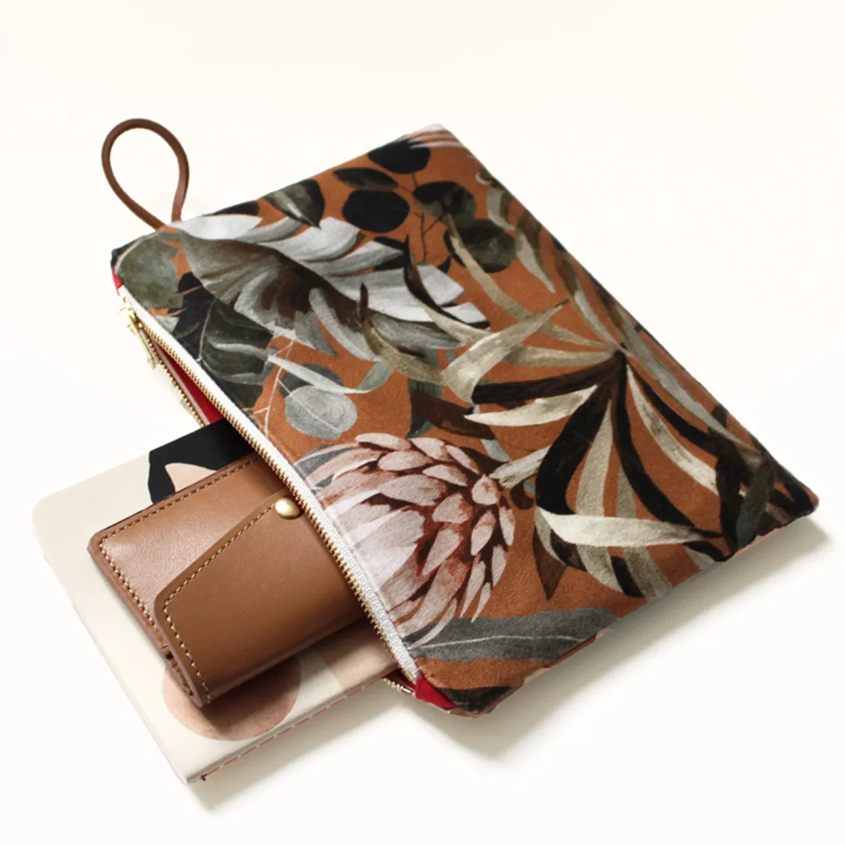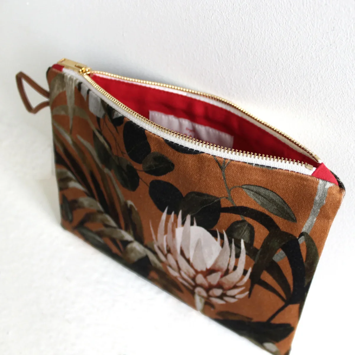 Mini pochette à fermeture éclair. Idéale pour y stocker vos essentiels du quotidien, petits accessoires, stylos et maquillage… Format 21 x 15 cm Fermeture zippée écrue dorée et doublure coton rouge.