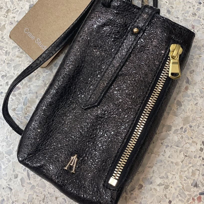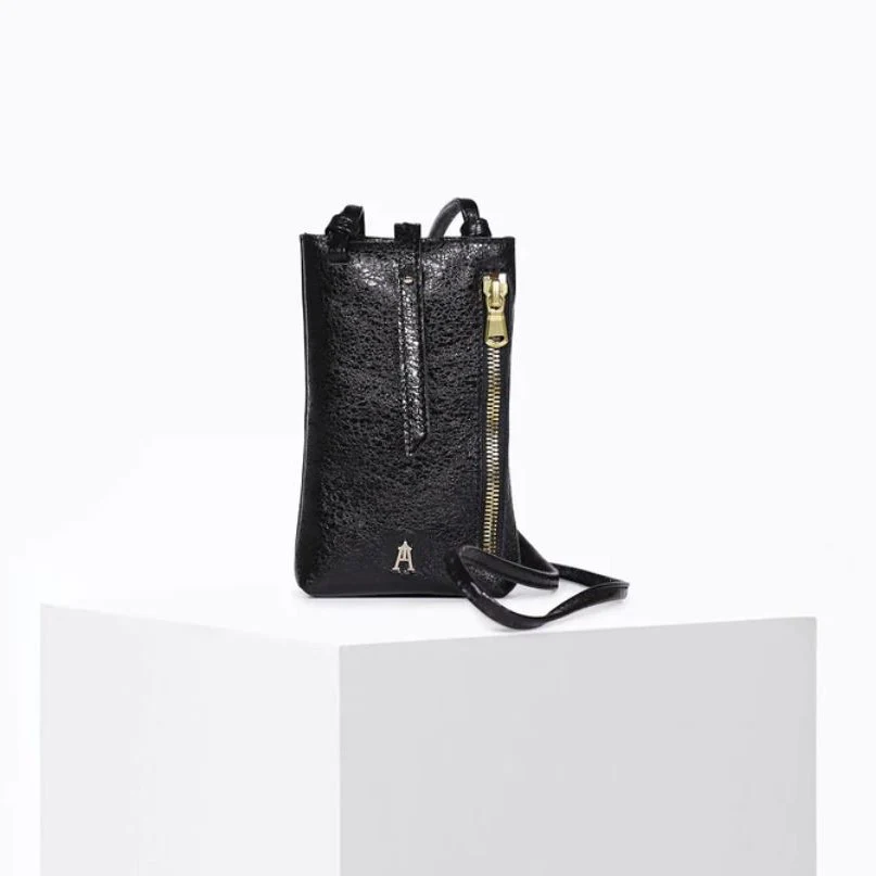 Pochette en cuir noir craquelée métallisée pour téléphone portable. On adore son côté léger et pratique avec ses compartiments à cartes et sa poche zippée