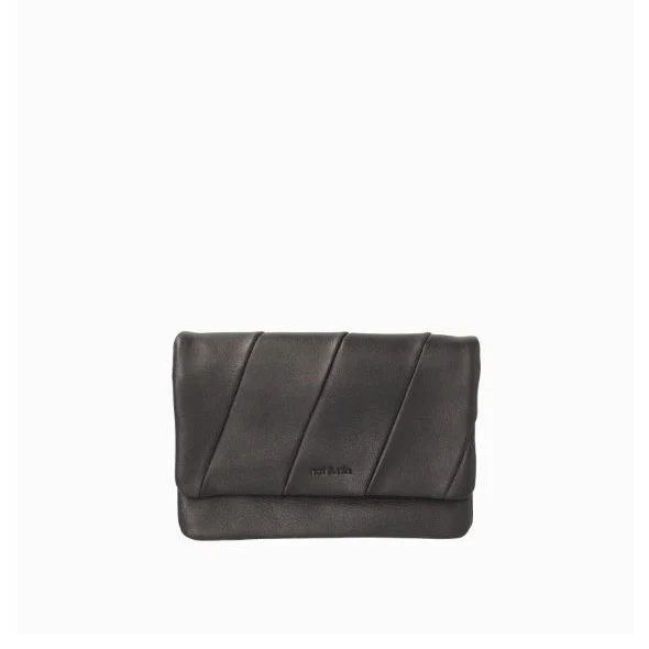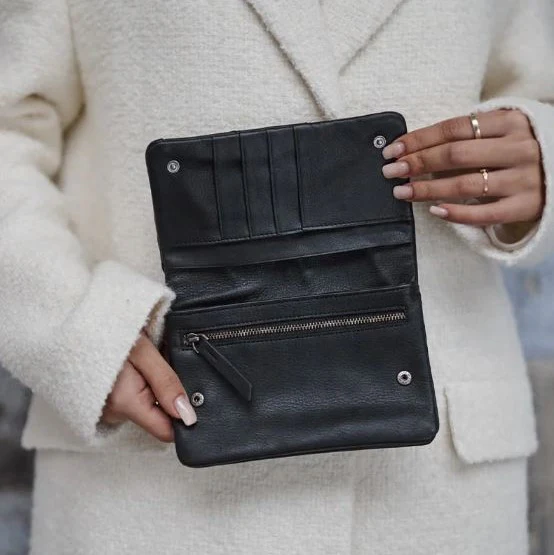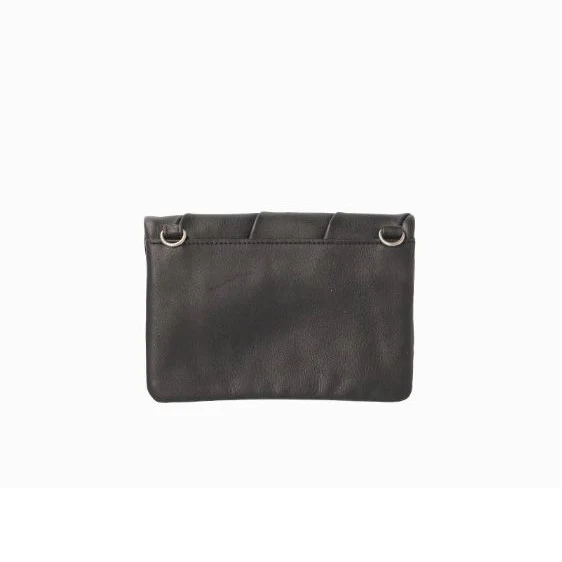Pochette cuir lisse noir avec bandoulière amovible (longueur max. 106 cm) et fermeture pressions. Elle a une poche plaquée à l’arrière. Vous trouverez 2 compartiments et 3 porte-cartes à l’intérieur. Sous le rabat : une poche zippée, 2 poches plaquées et 4 porte-cartes