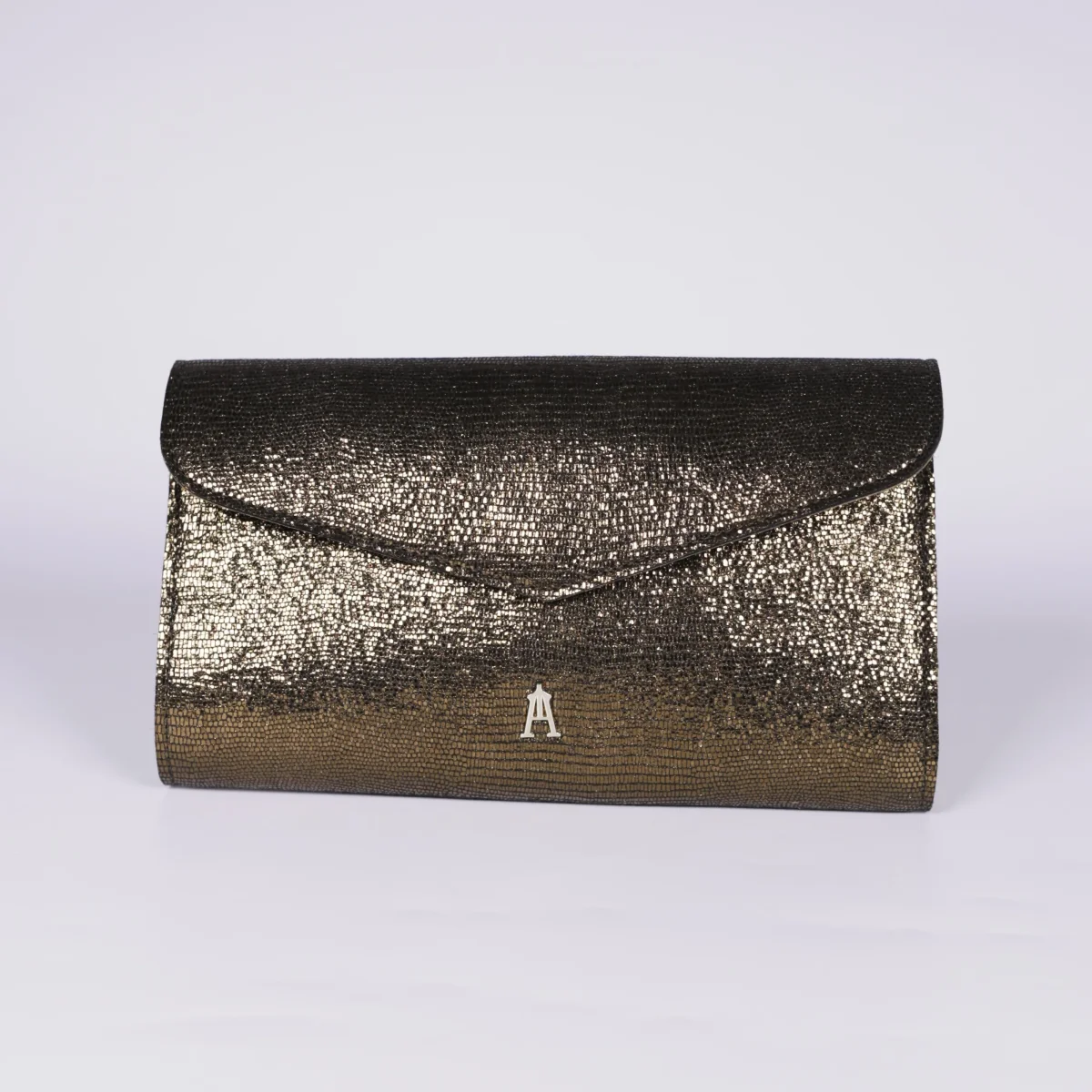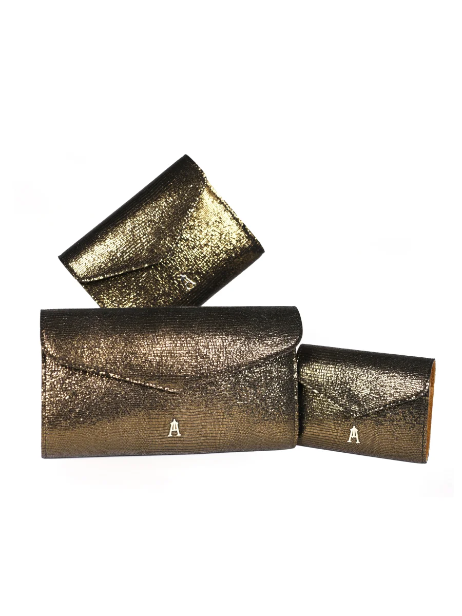 Portefeuille en cuir d’agneau au tannage végétal métallisé. Il est métallisé sur le dessus et à l’ouverture il se découvre une autre couleur.