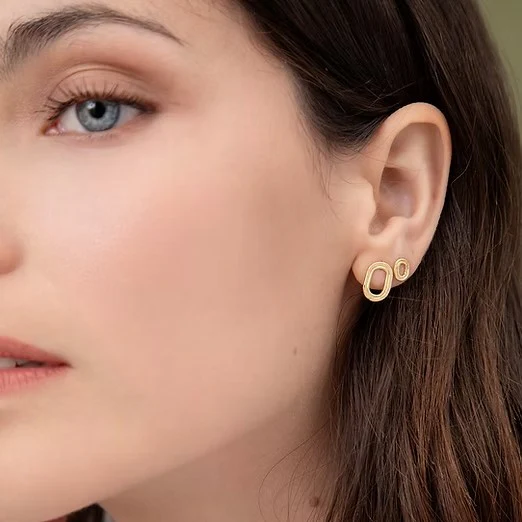 Boucles d’oreilles dorées à l’or fin 24 carats. Finition brossée. Longueur 0,6 cm. Largeur 0,5 cm. Bijou dessiné et fabriqué à la main par la créatrice Laure Mory dans son atelier parisien.
