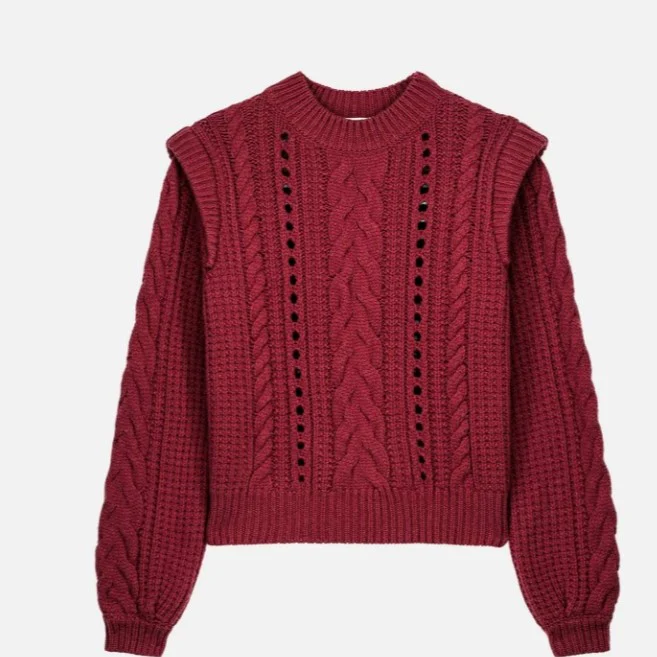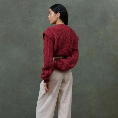 Ce pull en laine 100 % naturelle séduit par son effet de superposition au niveau des épaules, ses torsades élégantes et ses détails ajourés raffinés. La maille côtelée souligne délicatement le col, le bas des manches et le bas du vêtement, apportant une touche de texture et de confort.
