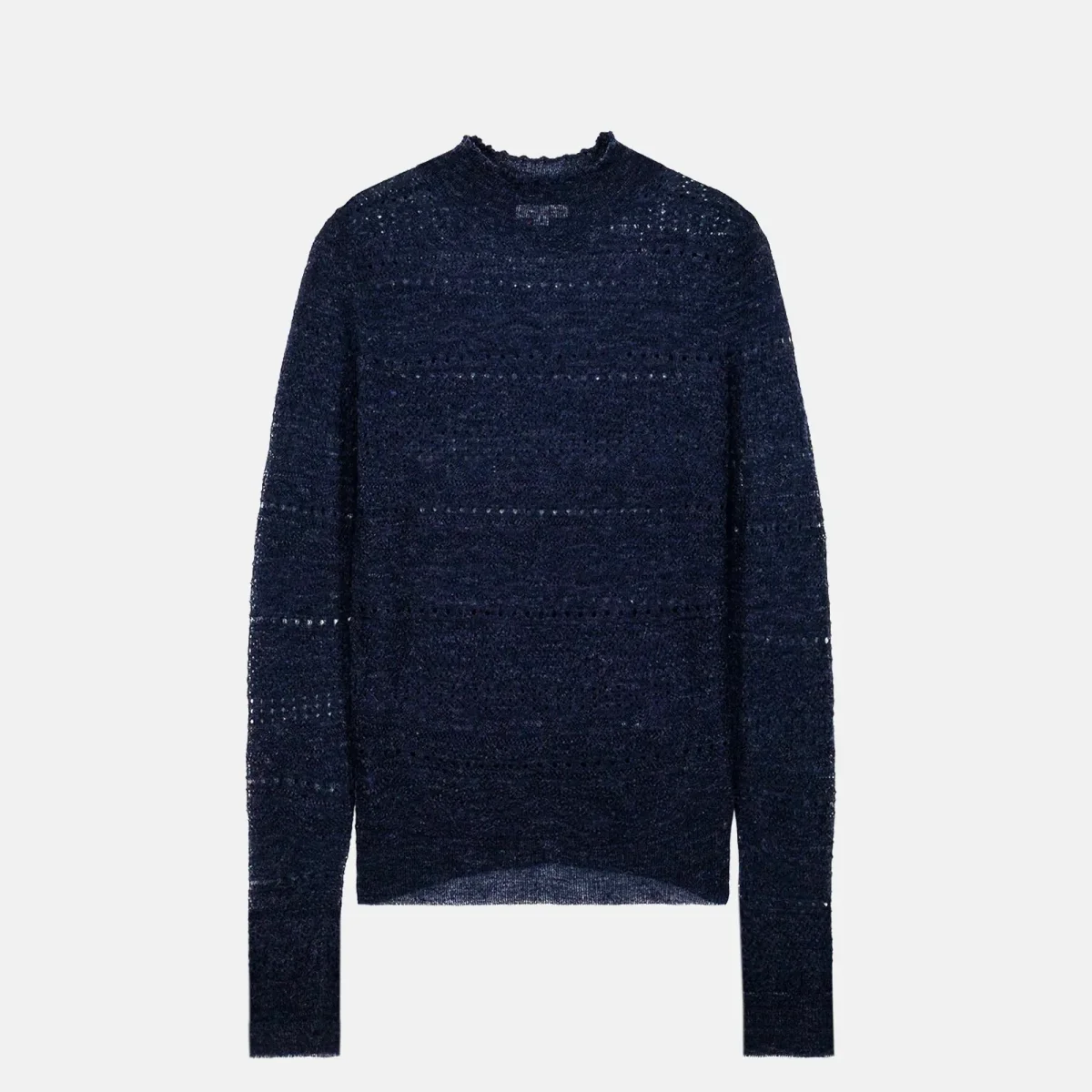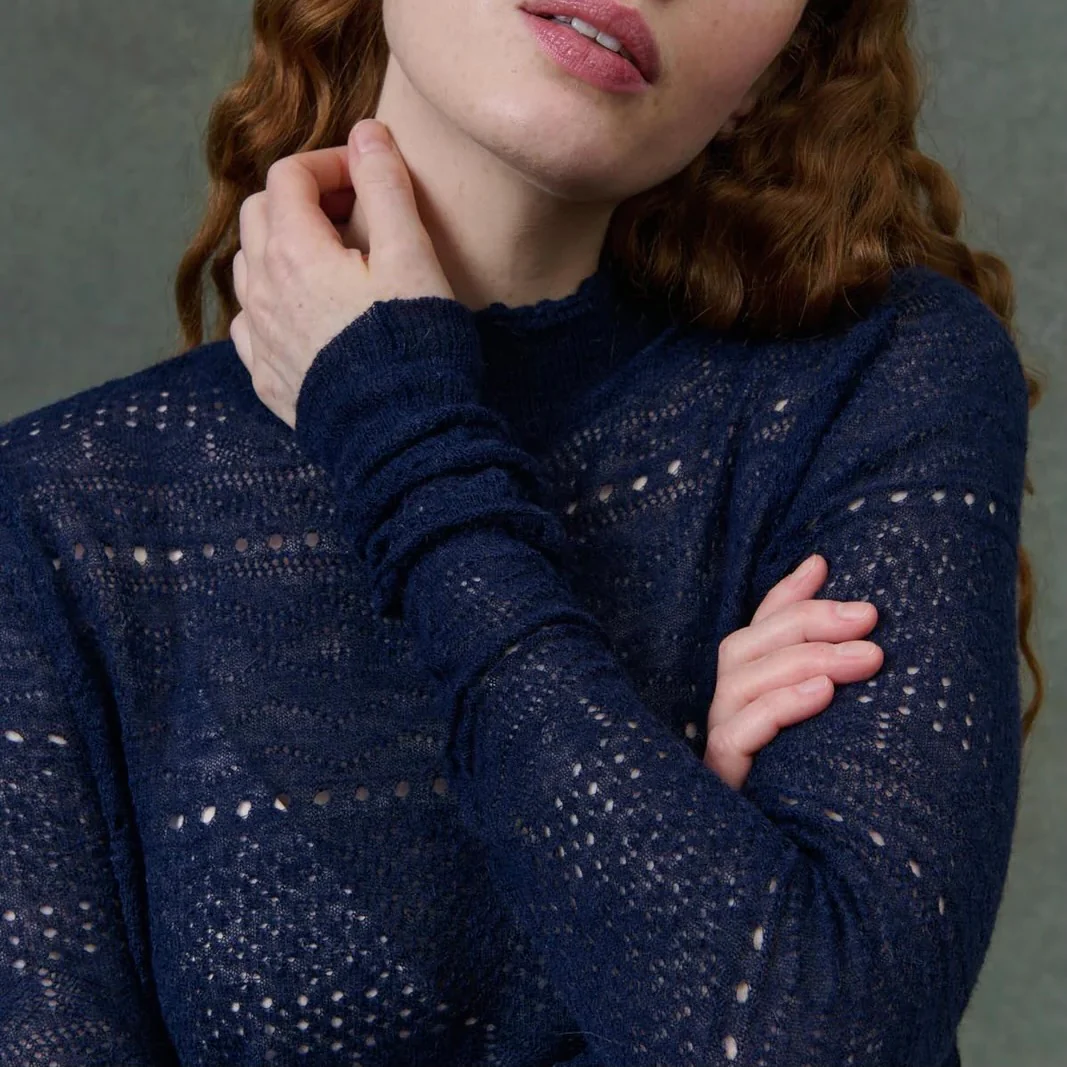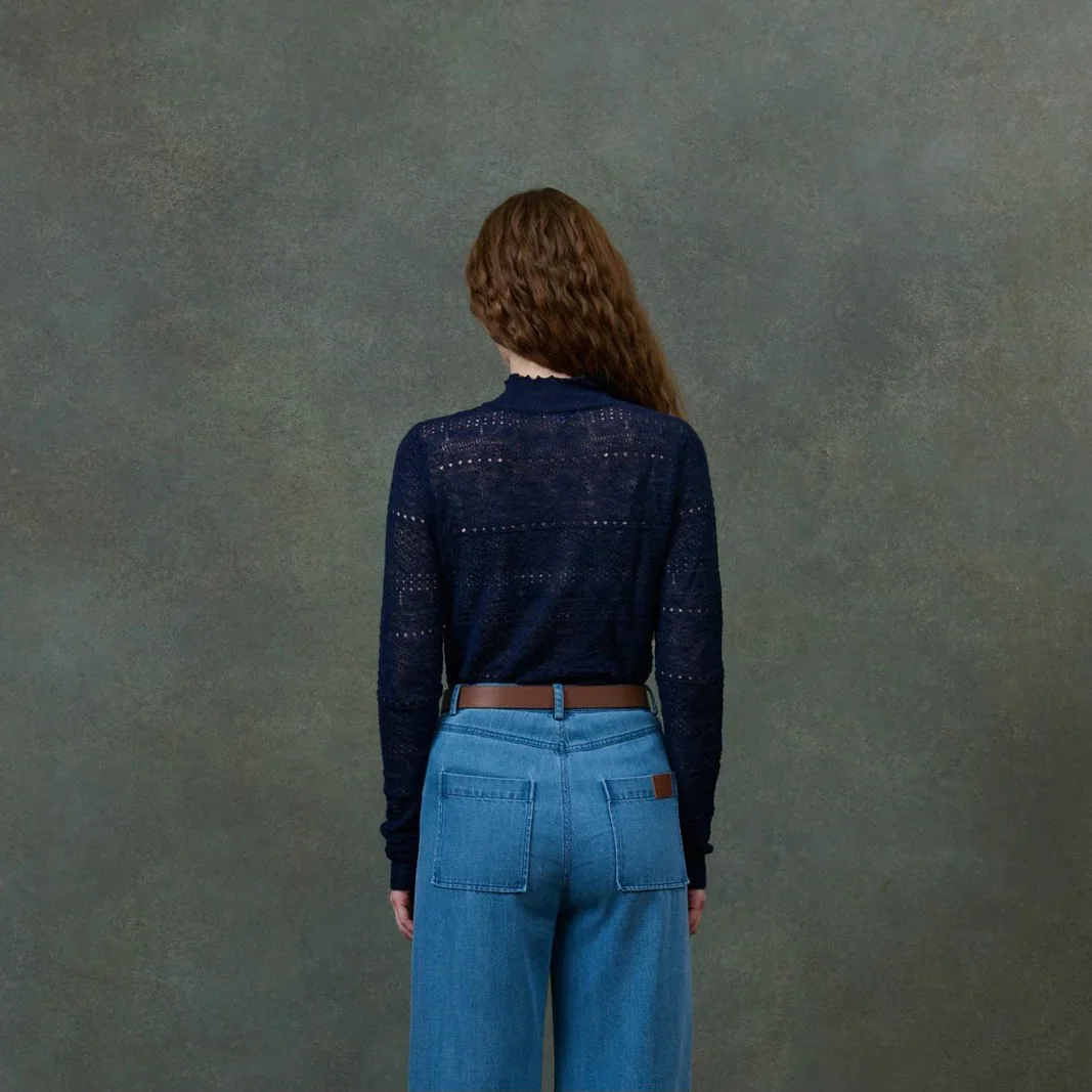 Un sous-pull délicat et ajusté, paré d’un effet dentelle raffiné et de détails ajourés, qui lui confèrent légèreté et sophistication. Le col montant est rehaussé de finitions roulottées, ajoutant une touche de féminité subtile.