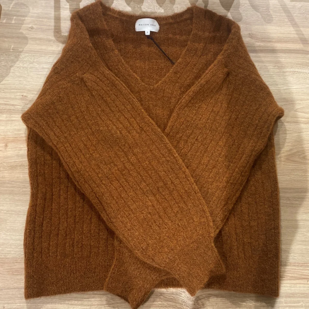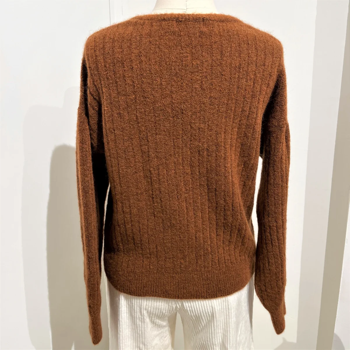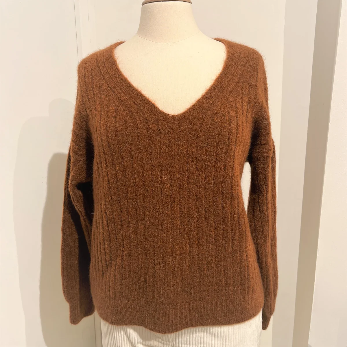 Pull en maille col V et manches tombantes bouffantes au niveau du bas de l’épaule. Excessivement doux il peut se porter à même la peau.