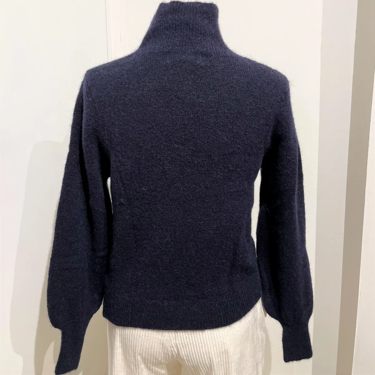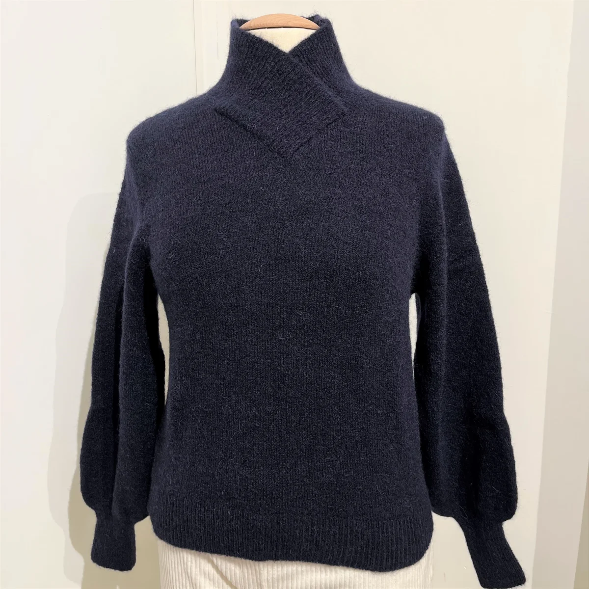 Pull en maille col montant croisé et manches longues. Retombé en dessous de la taille. Excessivement doux il peut se porter à même la peau.
