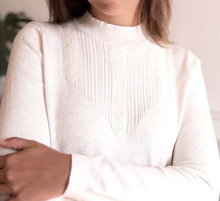 Pull léger avec une maille douce et agréable à porter avec de jolies détails au devant, ainsi qu’un col montant. Couleur écru. Composition: 50% Acrylique – 40% Laine- 10% Polyamide.