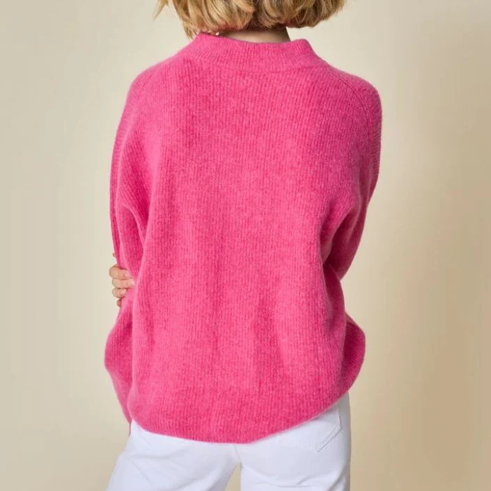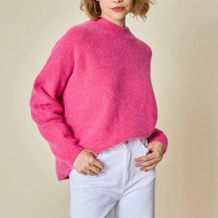 Pull en mohair, coupe droite et courte, encolure montante et manches légèrement arrondies.