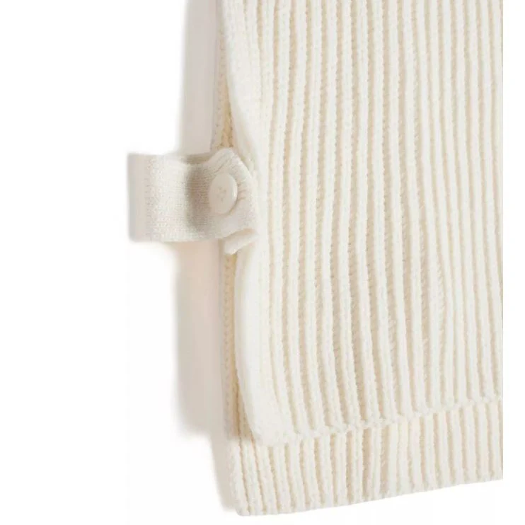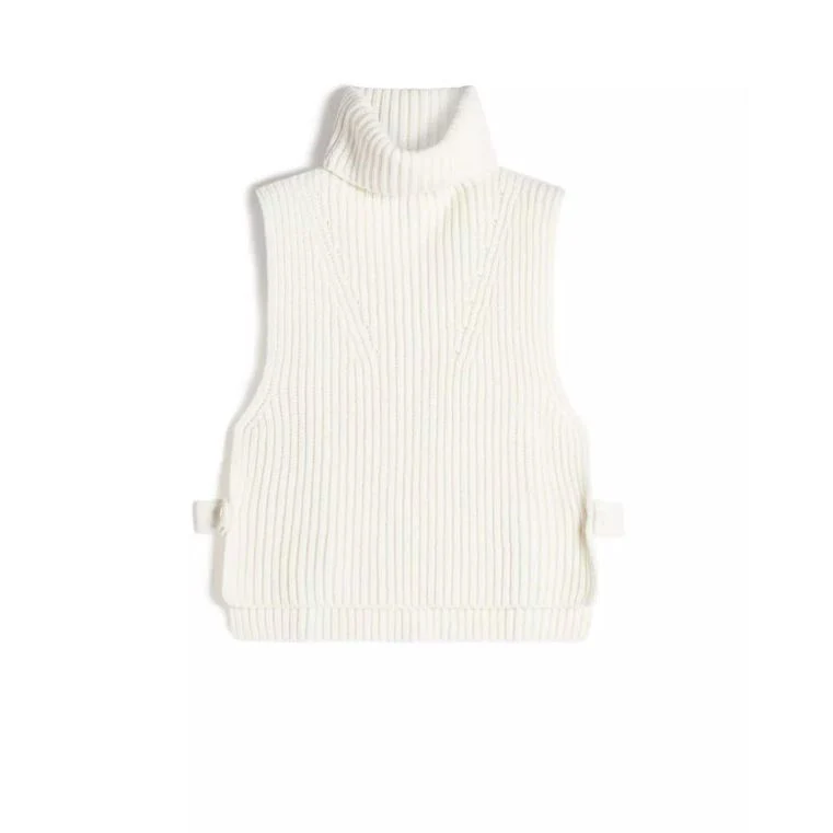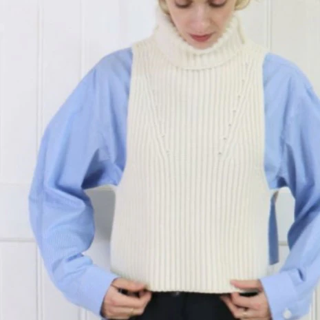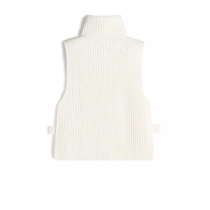Pull col roulé sans manches écru en laine mérinos et acrylique, certifié oeko-tex. Il s’associe à toutes vos tenues sans difficulté. Superposé à une robe, une chemise ou un tee-shirt, il apportera à votre silhouette de la fantaisie et du style ! Il est ouvert sur les côtés et s’ajuste à l’aide d’une petite patte boutonnée.