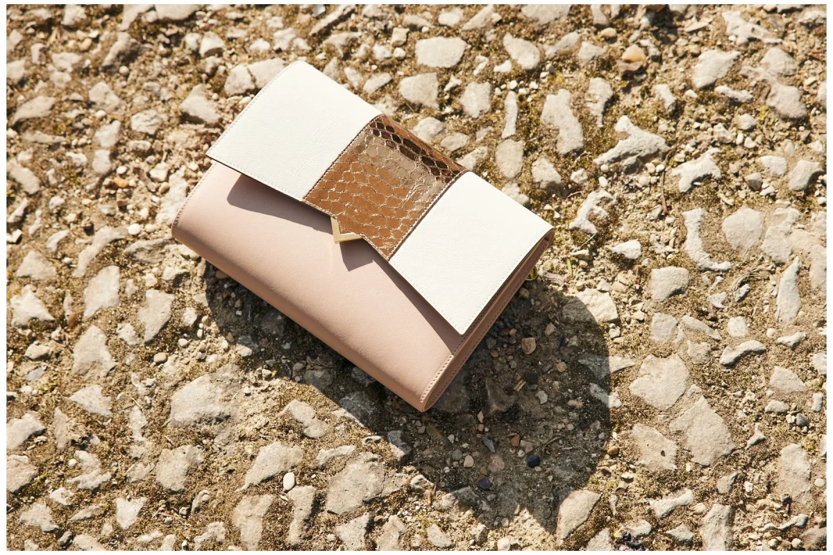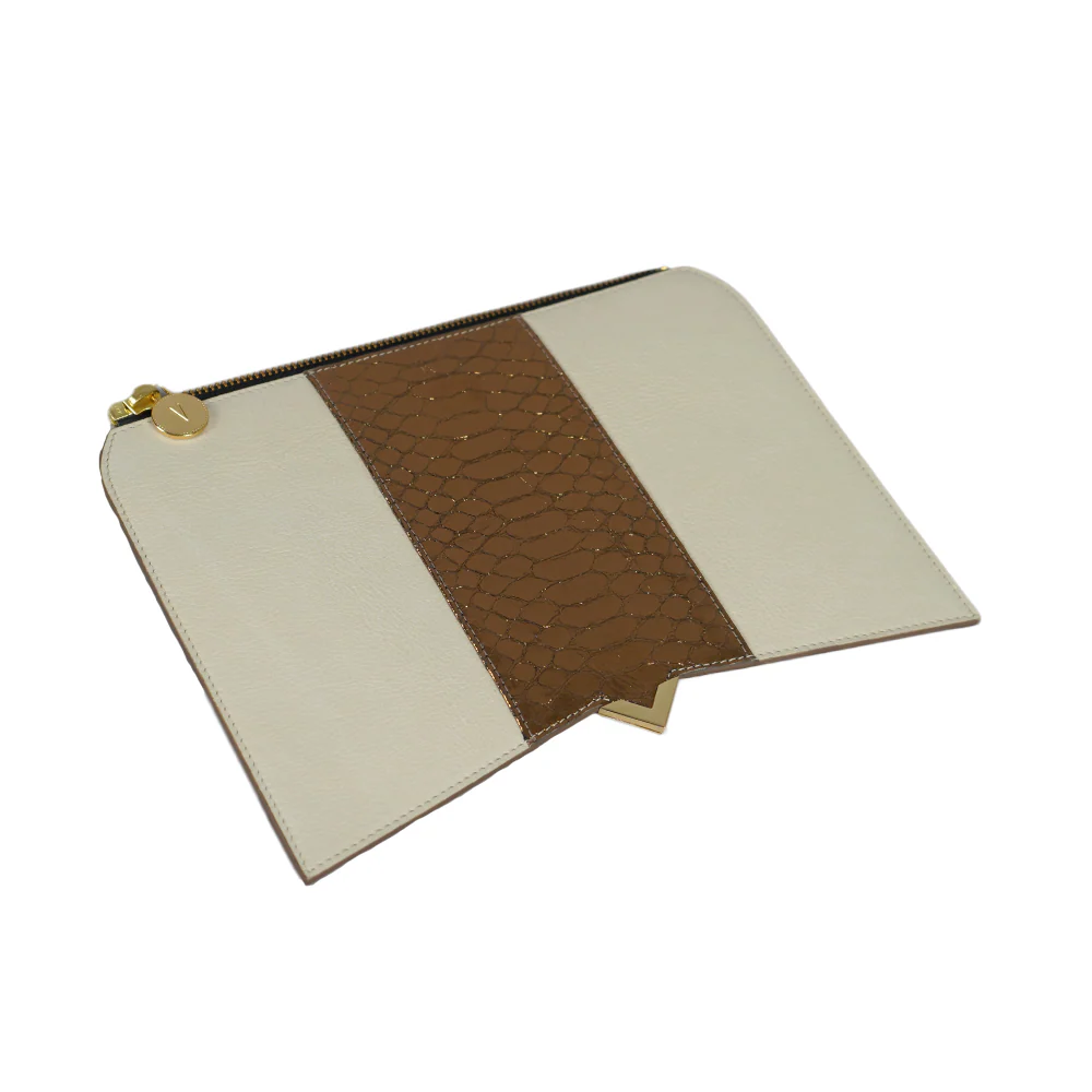 Le rabat Arya est à zipper par une fermeture éclair à la base de sac Roma. Composé d’un aplat en boa doré, et bordures blanches en cuir lisse. Il est élégant et tendance.